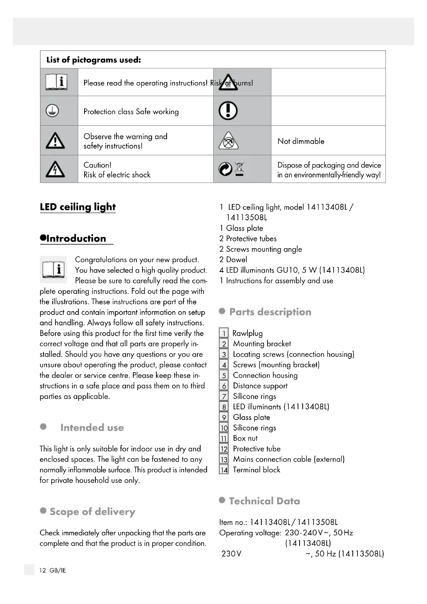 , 50 Hz (14113508L) List of pictograms used: Please read the operating instructions! Risk of burns! Protection class Safe working Observe the warning and safety instructions! Not dimmable Caution! Risk of electric shock Dispose of packaging and device in an environmentally-friendly way!13 GB/IE Introduction / Safety Introduction Nominal power: 4 x 5 W (14113408L) 1 x 10.5W (14113508L) Lamp: 4 x LED GU10, 5 W (14113408L) 1 x LED-Modul, 10.5 W (LED not exchangeable 14113508L) Power factor/ Rated current per LED module: 0.54 / 80 mA (14113508L) Protection class: I / Protection type: IP20 Safety Safety notices Damage due to failure to comply with these operat- ing instructions will invalidate the warranty! We ass ume no liability for consequential damage! We assume no liability for material damage or personal injury due to improper handling or failure to comply with the safety instructions! Do not leave the light or packaging material ly- ing unattended. Plastic film or bags, plastic parts, etc. can be dangerous for children to play with. Caution! Risk of electric shock Ensure that a qualified electrician, or a person trained to carry out electrical installations, per- forms the electrical installation. Always check the light, power supply, and mains cable for damage before plugging it in. Never use the light if it shows any signs of damage. CAUTION! A damaged mains cable indicates a life-threatening danger due to electric shock. In the event of damage, repairs or other prob- lems with the light please contact the service centre or a qualified electrician. Prior to installation, remove the fuse or switch off the circuit breaker (0 setting) in the fuse box. Prior to installation, verify the available mains voltage corresponds with the operating voltage required for the light (230 - 240 V