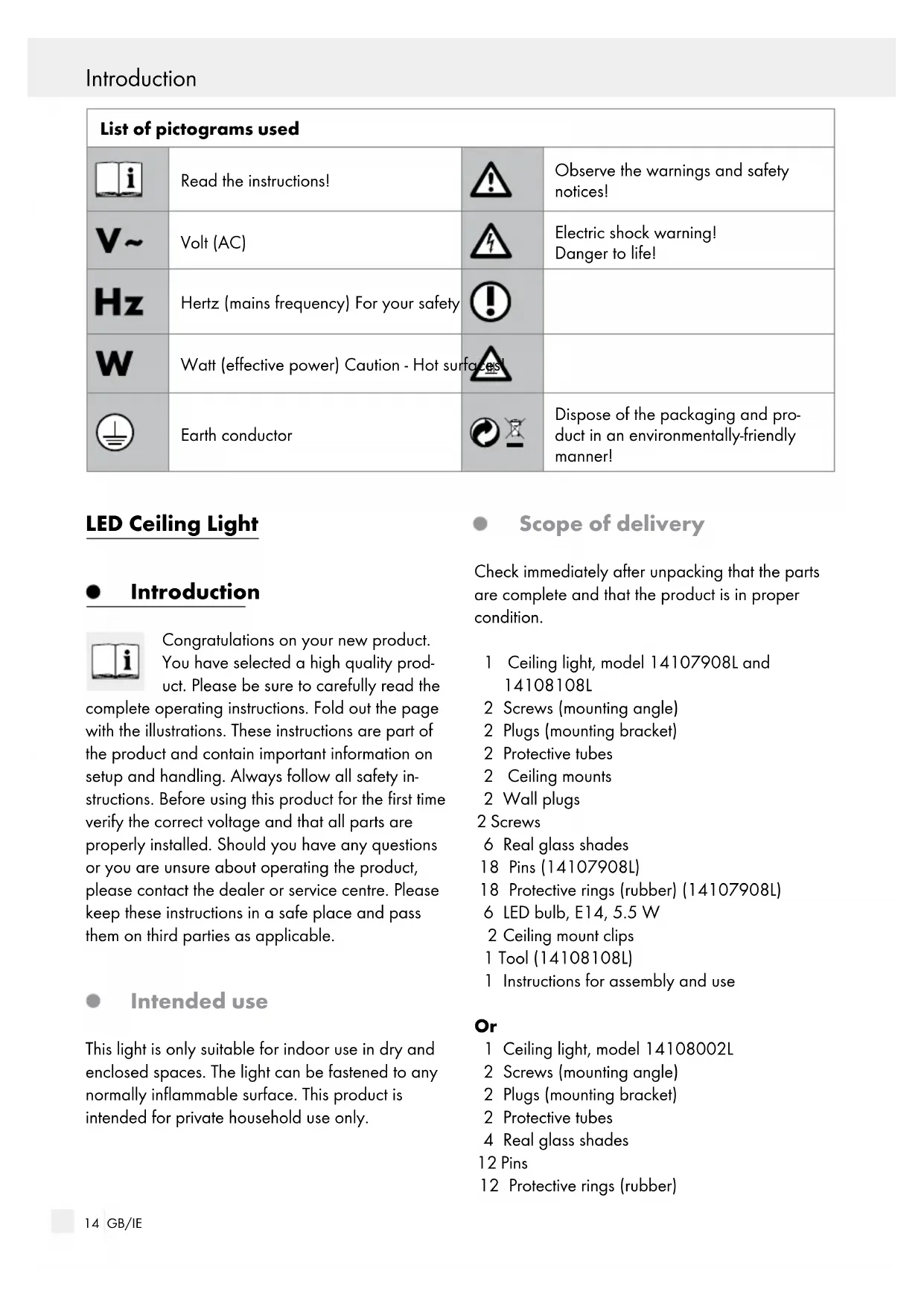 1 Ceiling light, model 14108002L 2 Screws (mounting angle) 2 Plugs (mounting bracket) 2 Protective tubes 4 Real glass shades 12 Pins 12 Protective rings (rubber) List of pictograms used Read the instructions! Observe the warnings and safety notices! Volt (AC) Electric shock warning! Danger to life! Hertz (mains frequency) For your safety Watt (effective power) Caution - Hot surfaces! Earth conductor Dispose of the packaging and pro- duct in an environmentally-friendly manner!15 GB/IE Introduction / Safety 1 Glass plate 2 Chrome decorative rings for GU10 light bulbs 4 LED light bulbs, E14, 5.5 W 2 LED light bulbs, GU10, 5 W 2 Spacers 4 Washers 2 Locating screws 1 Instructions for assembly and use Parts description