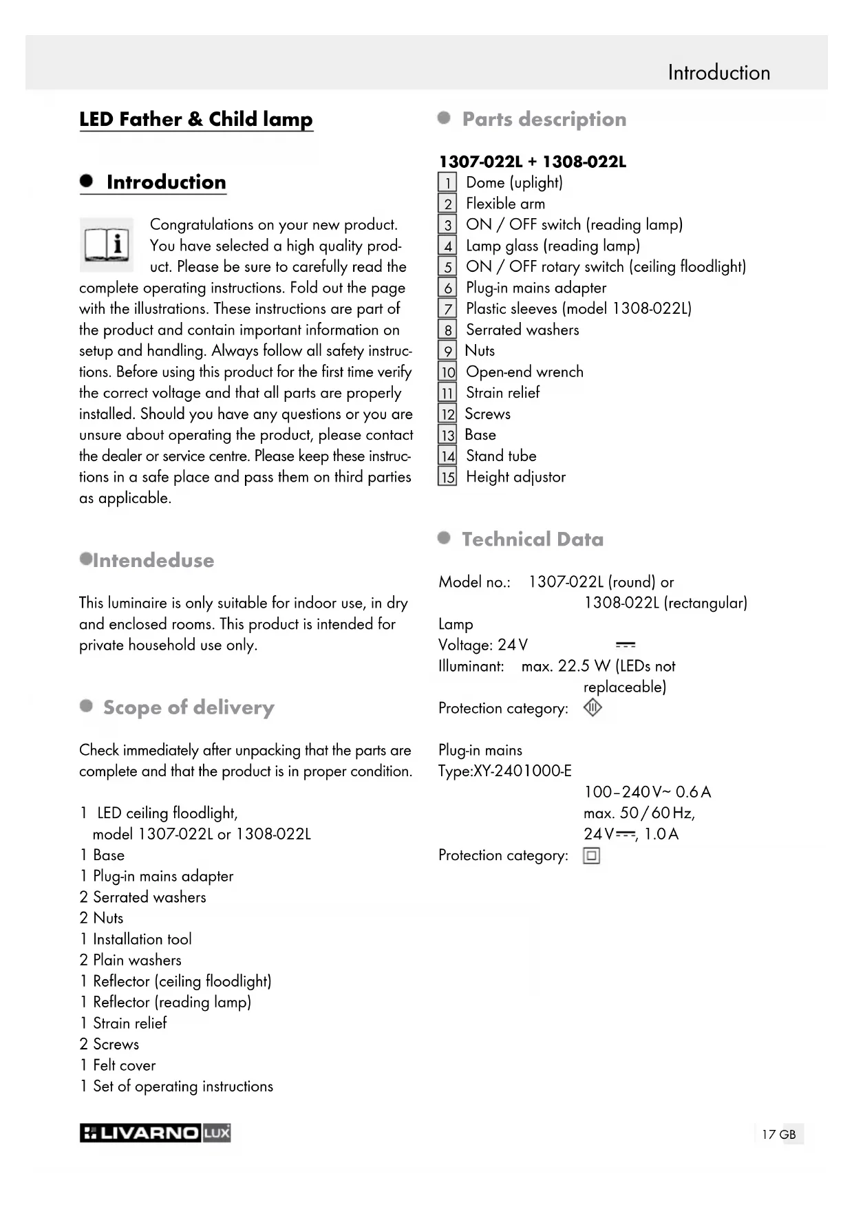 Height adjustor Technical Data Model no.: 1307-022L (round) or 1308-022L (rectangular) Lamp Voltage: 24 V Illuminant: max. 22.5 W (LEDs not replaceable) Protection category: Plug-in mains Type: XY-2401000-E 100–240 V∼ 0.6 A max. 50 / 60 Hz, 24 V , 1.0 A Protection category:18 GB Safety advice Safety advice Damage due to failure to comply with these operat- ing instructions will invalidate the guarantee! We assume no liability for consequential damage! We assume no liability for material damage or personal injury due to improper handling or failure to comply with the safety instructions! Avoid the risk of fatal injury from electric shock Check the light for damage every time before you use it. Never use the light if it shows any signs of damage. CAUTION! A damaged light means danger of death from electric shock! In the event of damage, repairs or other problems with the light please contact the service centre or a qualified electri- cian. For the prevention of hazards, a damaged flexible lead of this lamp may only be exchanged by the manufacturer, his service representative or by an equally qualified specialist! Ensure before use that the available mains voltage is the same as the voltage required for operating the lamp (100–240 V∼). Ensure that the light does not come into contact with water or other liquids under any circum- stances. This lamp is only suitable for use in living areas (not damp rooms) and may only be used in ac- cordance with its design. This lamp may only be used with the plug-in adapter included in the delivery. Never open any of the components of the elec- trical equipment or insert any objects into the same components. This will pose a risk of fatal injury from electric shock. Prevent fire and injury hazards CAUTION! RISK OF INJURY! Check every illuminant for damage immediately upon un- packing. Do not install the light if the illuminants are defective. In this case contact the service centre for a replacement. CAUTION! DANGER OF BURN INJURIES! Ensure that the light has been switched off and has cooled before touching it, to avoid burn in- juries. Lamps develop intense heat in the area of the lamp head. Do not allow any objects to cover the light. Excessive heat can result in a fire. Never leave the light operating unattended. Do not leave the light or packaging material ly- ing unattended. Plastic film or bags, plastic parts etc. can turn into dangerous toys for children. The type of LED illuminant included is not suitable for dimmer or electronic switches. This product does not contain any parts that can be serviced by the user. The LED illuminant cannot be exchanged. Safe working Install the light so that it is protected from mois- ture and dirt. Carefully prepare the installation and allow suf- ficient time. Organise all parts and any necessary additional tools or materials before starting so they are easy to reach. Always be attentive when working! Always pay attention to what you are doing and act with common sense. Never install the light if you are having difficulty concentrating or do not feel well. Start-up / Maintenance and Cleaning / Disposal19 GB Safety advice Start-up / Maintenance and Cleaning / Disposal Start-up Mounting the light Attach the plastic sleeves