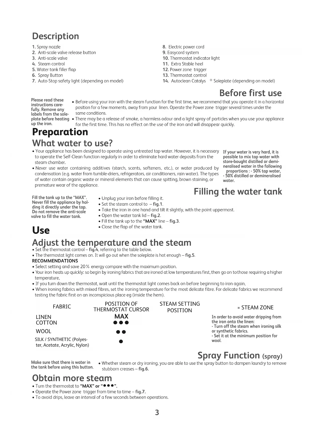 - Turn the thermostat to “MAX” or “•••”.• Operate the Power zone trigger from time to time – fig.7.• To avoid drips, leave an interval of a few seconds between operations.Fill the tank up to the “MAX”.Never fill the appliance by hol-ding it directly under the tap.Do not remove the anti-scalevalve to fill the water tank.If your water is very hard, it ispossible to mix tap water withstore-bought distilled or demi-neralised water in the following proportions : - 50% tap water,- 50% distilled or demineralisedwater.= STEAM ZONEIn order to avoid water dripping fromthe iron onto the linen:- Turn off the steam when ironing silkor synthetic fabrics.- Set it at the minimum position forwool.Make sure that there is water inthe tank before using this button.FABRICPOSITION OFTHERMOSTAT CURSORSTEAM SETTINGPOSITIONLINENCOTTON WOOL SILK / SYNTHETIC (Polyes-ter, Acetate, Acrylic, Nylon) MAX
