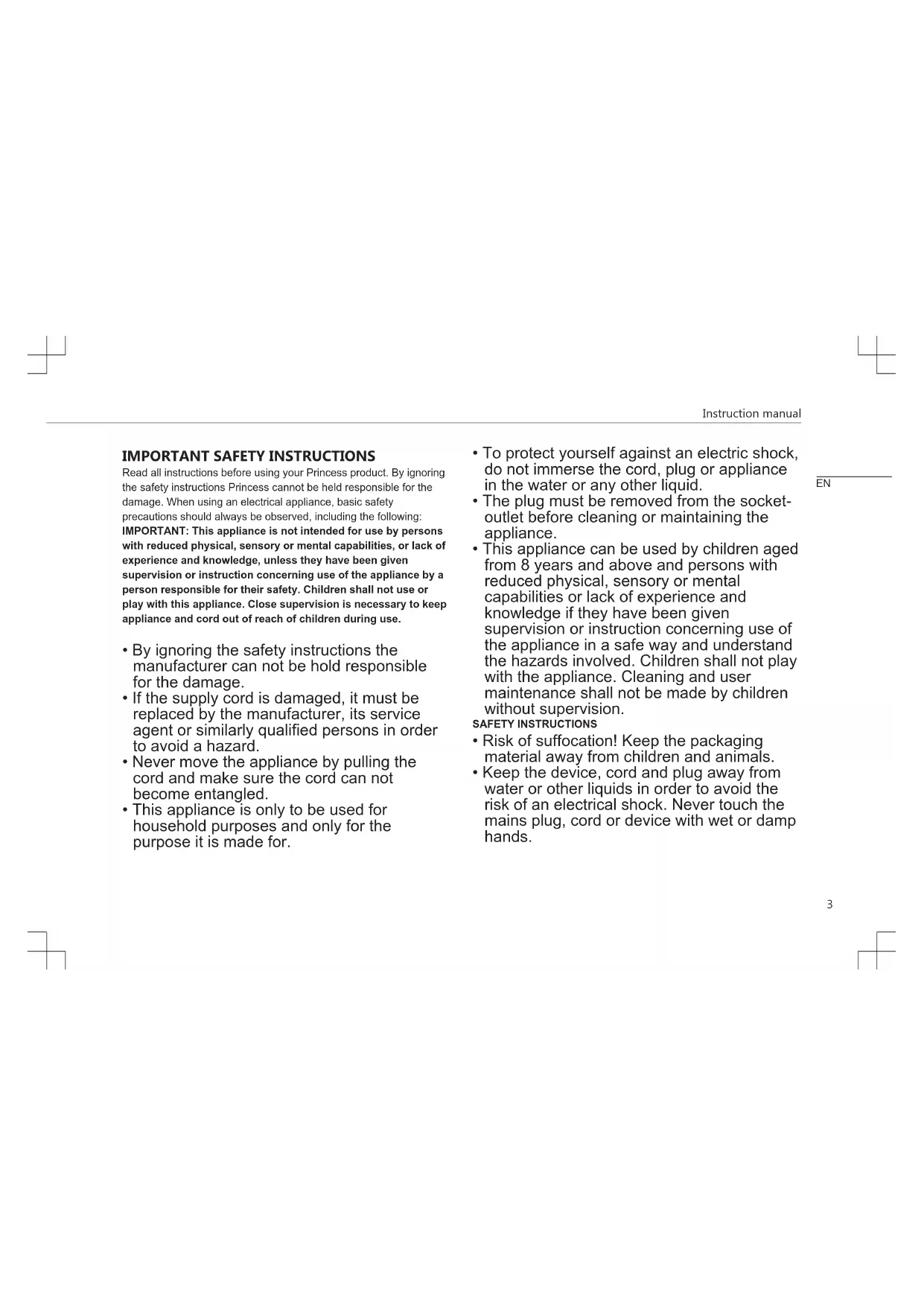 Read all instructions before using your Princess product. By ignoring the safety instructions Princess cannot be held responsible for the damage. When using an electrical appliance, basic safety precautions should always be observed, including the following: IMPORTANT: This appliance is not intended for use by persons with reduced physical, sensory or mental capabilities, or lack of experience and knowledge, unless they have been given supervision or instruction concerning use of the appliance by a person responsible for their safety. Children shall not use or play with this appliance. Close supervision is necessary to keep appliance and cord out of reach of children during use.