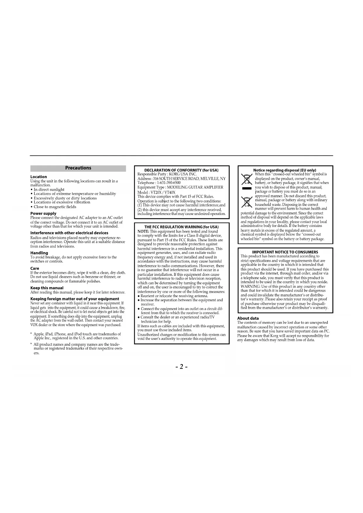 - All product names and company names are the trade- marks or registered trademarks of their respective own- ers. DECLARATION OF CONFORMITY (for USA) Responsible Party : KORG USA INC. Address : 316 SOUTH SERVICE ROAD, MELVILLE, NY Telephone : 1-631-390-6500 Equipment Type : MODELING GUITAR AMPLIFIER Model : VT20X / VT40X This device complies with Part 15 of FCC Rules. Operation is subject to the following two conditions: (1) This device may not cause harmful interference,and (2) this device must accept any interference received, including interference that may cause undesired operation.