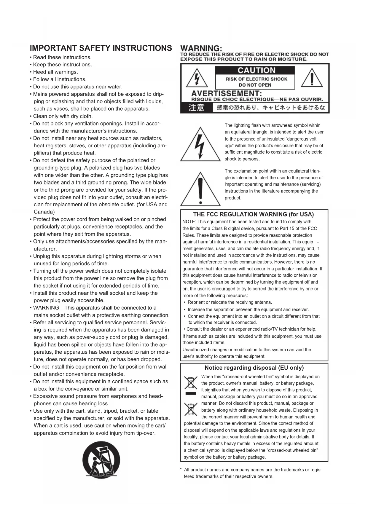 - Consult the dealer or an experienced radio/TV technician for help. If items such as cables are included with this equipment, you must use those included items. Unauthorized changes or modication to this system can void the user’s authority to operate this equipment. Notice regarding disposal (EU only) When this “crossed-out wheeled bin” symbol is displayed on the product, owner’s manual, battery, or battery package, it signies that when you wish to dispose of this product, manual, package or battery you must do so in an approved manner. Do not discard this product, manual, package or battery along with ordinary household waste. Disposing in the correct manner will prevent harm to human health and potential damage to the environment. Since the correct method of disposal will depend on the applicable laws and regulations in your locality, please contact your local administrative body for details. If the battery contains heavy metals in excess of the regulated amount, a chemical symbol is displayed below the “crossed-out wheeled bin” symbol on the battery or battery package.