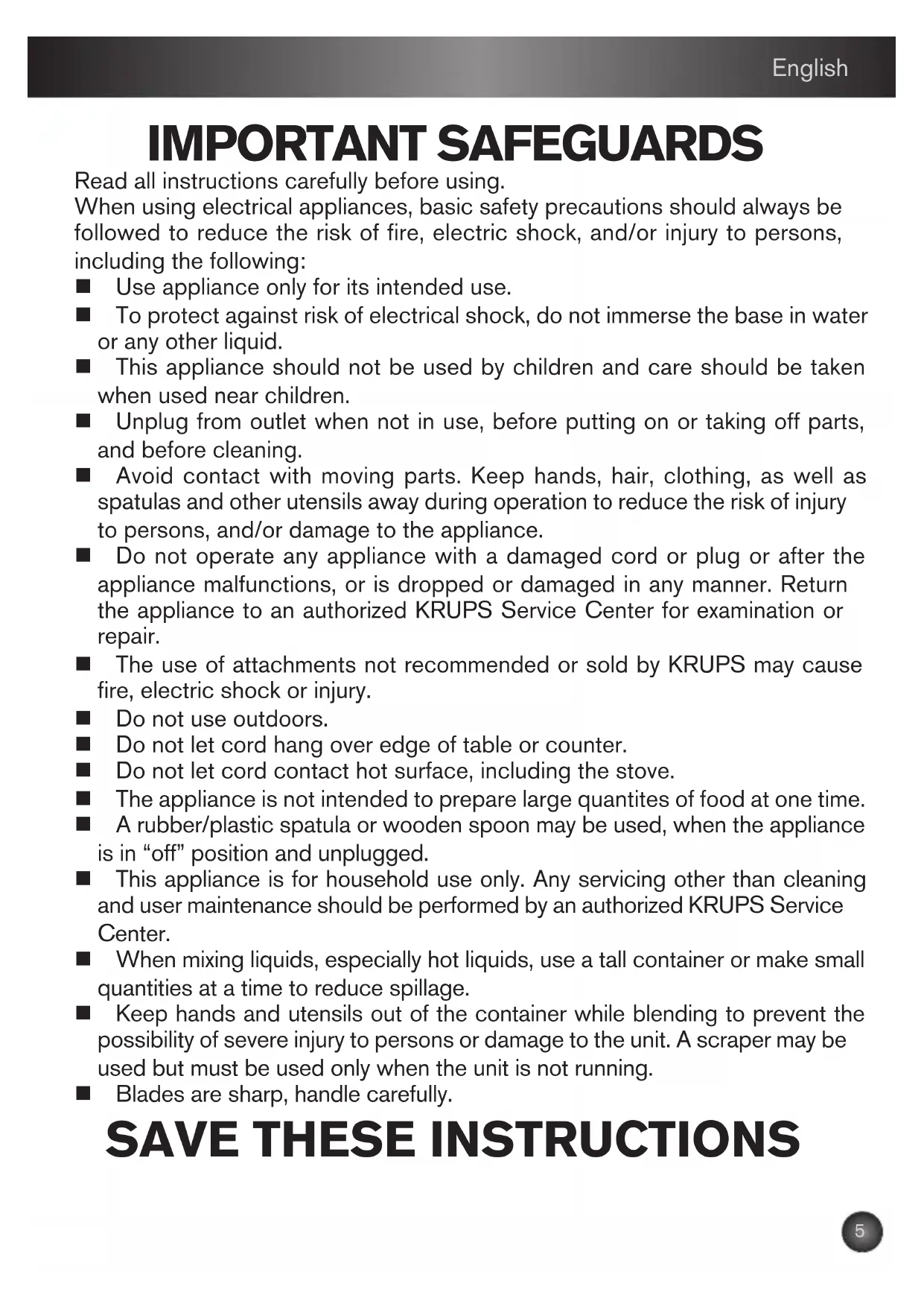 IMPORTANT SAFEGUARDS Read all instructions carefully before using. When using electrical appliances, basic safety precautions should always be followed to reduce the risk of fire, electric shock, and/or injury to persons, including the following: Use appliance only for its intended use. To protect against risk of electrical shock, do not immerse the base in water or any other liquid. This appliance should not be used by children and care should be taken when used near children. Unplug from outlet when not in use, before putting on or taking off parts, and before cleaning. Avoid contact with moving parts. Keep hands, hair, clothing, as well as spatulas and other utensils away during operation to reduce the risk of injury to persons, and/or damage to the appliance. Do not operate any appliance with a damaged cord or plug or after the appliance malfunctions, or is dropped or damaged in any manner. Return the appliance to an authorized KRUPS Service Center for examination or repair. The use of attachments not recommended or sold by KRUPS may cause fire, electric shock or injury. Do not use outdoors. Do not let cord hang over edge of table or counter. Do not let cord contact hot surface, including the stove. The appliance is not intended to prepare large quantites of food at one time. A rubber/plastic spatula or wooden spoon may be used, when the appliance is in “off” position and unplugged. This appliance is for household use only. Any servicing other than cleaning and user maintenance should be performed by an authorized KRUPS Service Center. When mixing liquids, especially hot liquids, use a tall container or make small quantities at a time to reduce spillage. Keep hands and utensils out of the container while blending to prevent the possibility of severe injury to persons or damage to the unit. A scraper may be used but must be used only when the unit is not running. Blades are sharp, handle carefully.