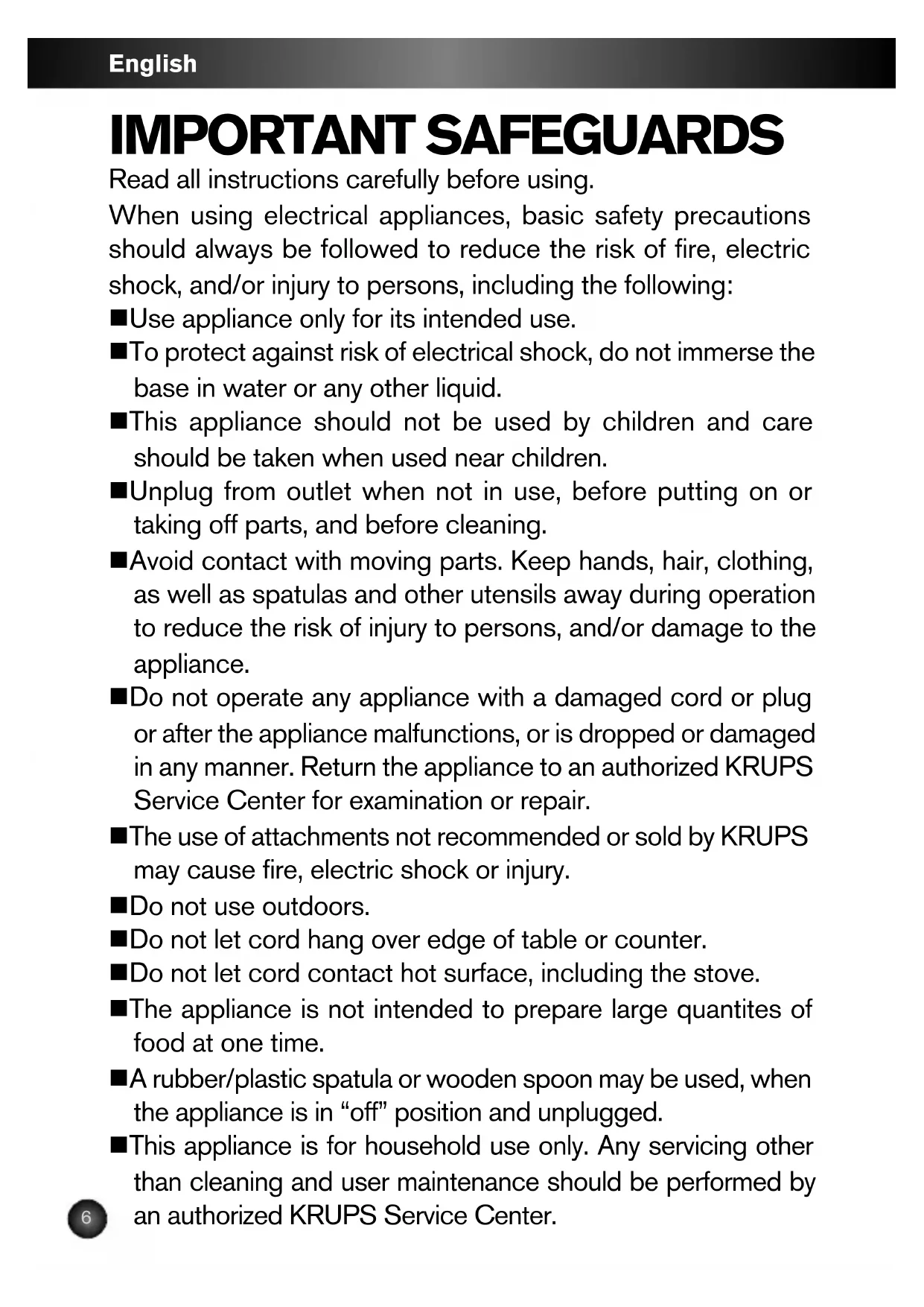 IMPORTANT SAFEGUARDS Read all instructions carefully before using. When using electrical appliances, basic safety precautions should always be followed to reduce the risk of fire, electric shock, and/or injury to persons, including the following: Use appliance only for its intended use. To protect against risk of electrical shock, do not immerse the base in water or any other liquid. This appliance should not be used by children and care should be taken when used near children. Unplug from outlet when not in use, before putting on or taking off parts, and before cleaning. Avoid contact with moving parts. Keep hands, hair, clothing, as well as spatulas and other utensils away during operation to reduce the risk of injury to persons, and/or damage to the appliance. Do not operate any appliance with a damaged cord or plug or after the appliance malfunctions, or is dropped or damaged in any manner. Return the appliance to an authorized KRUPS Service Center for examination or repair. The use of attachments not recommended or sold by KRUPS may cause fire, electric shock or injury. Do not use outdoors. Do not let cord hang over edge of table or counter. Do not let cord contact hot surface, including the stove. The appliance is not intended to prepare large quantites of food at one time. A rubber/plastic spatula or wooden spoon may be used, when the appliance is in “off” position and unplugged. This appliance is for household use only. Any servicing other than cleaning and user maintenance should be performed by an authorized KRUPS Service Center. IFU_KR_MIXER_GPA-1-3_NAFTA_2550699-02_Mise en page 1 12/04/12 17:12 Page6English To reduce the risk of injury, never place cutting blade on base without first putting bowl properly in place. Be certain cover is securely locked in place before operating appliance. To reduce the risk of fire or electric shock, do not operate any heating appliance beneath the mounted unit. Do not mount the storage bracket/unit over or near any portion of a heating or cooking appliance or a sink or basin. When mixing liquids, especially hot liquids, use a tall container or make small quantities at a time to reduce spillage. Keep hands and utensils out of the container while blending to prevent the possibility of severe injury to persons or damage to the unit. A scraper may be used but must be used only when the unit is not running. Blades are sharp, handle carefully. SAVE THESE INSTRUCTIONS CAUTION This appliance complies with applicable technical rules and standards at the time of manufacture. Do not leave the appliance within reach of children. The blades supplied with this appliance are sharp, young children or severely disabled persons should always be supervised when using this appliance. An electrical appliance is not a toy and should be kept out of reach of children. This appliance is intended for household use only. Do not use it for commercial purposes. Any servicing other than cleaning and user maintenance should be performed by the nearest authorized KRUPS Service Center.