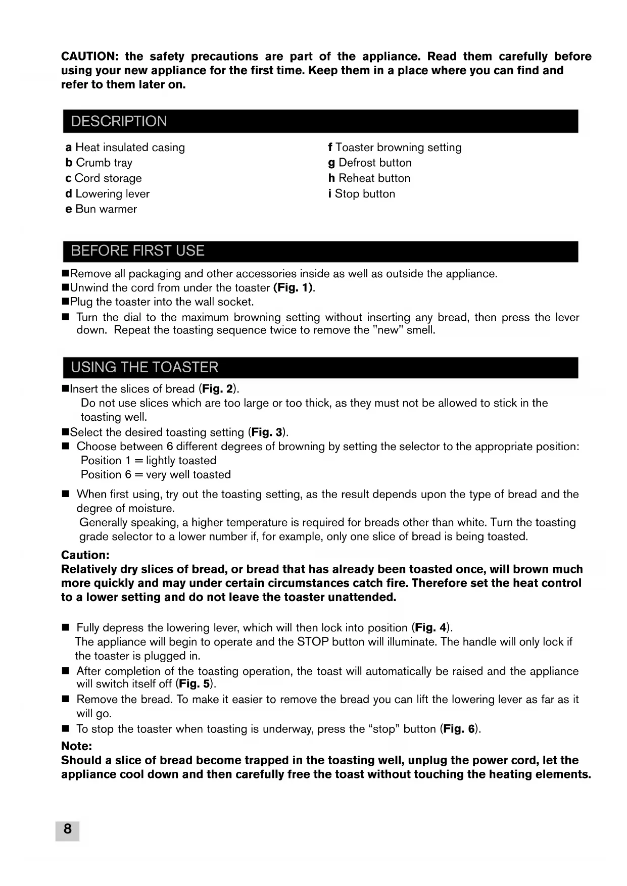 KR_TOASTER_PRELUDE_EO_NC00122252_Mise en page 29/04/14 14:06 Page89 Bun Warmer n Raise the bun warmer by pressing the handle on the corresponding bun warmer function (e) (Fig. 7). n Position the rolls on the shelves and press on the lowering lever until it locks automatically. Do not go beyond position 2. Start the appliance (Fig. 8). n Please take care for rolls rewarming function that the rolls and the lift have to be in the right position (Fig. 9). Do not put any pastries directly on the toaster to reheat them. Use the bun warmer instead (e). n To improve the results, turn the rolls over and repeat the toasting operation. n After use, lower the bun warmer by raising the handle on the bun warmer feature. n The bun warmer should not be used for longer than 10 minutes. Defrost feature n The toaster has a pre-programmed defrosting feature. Toasting frozen bread takes longer than toasting bread which is not frozen. n Insert one or two frozen slices of bread or toast in the toaster (Fig. 10). n Select the desired toasting level and lower the handle (please see the "OPERATING MODE” paragraph). n Press the ” ” button (Fig. 10). n The "DEFROST" and "STOP" buttons will illuminate. Reheat feature n The toaster has a pre-programmed feature to reheat pieces of bread or toast without toasting them too much. n The reheating time is automatic, regardless of the position of the setting button (roughly 30 seconds). n Insert the pieces of bread or toast in the toaster and lower the handle. n Press the ” ” button (Fig. 11). n The “REHEAT” and “STOP” buttons will illuminate. n Before pulling out the crumb tray, allow the toaster to cool for at least ten minutes after completion of the preceding toasting operation. n Before commencing the cleaning operation, pull out the mains plug. n It can be removed by pressing above, avoid all contact with metal parts. Clean the toaster regularly (Fig. 12). n Never immerse the appliance in water or put it under running water. n Never use an abrasive sponge to clean the toaster. Clean it with a damp cloth and wipe it with a soft, dry cloth in order to make it shine. n Remove the crumb tray by pressing above and remove the crumbs (Fig. 12). n Wipe using a damp cloth then return the crumb tray to its place. n Never use the toaster without the crumb tray. CLEANING ADDITIONAL ACCESSORIES