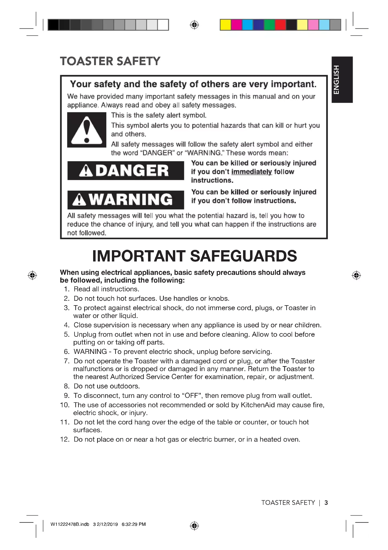 Crumb tray (not shown) Extra-wide slots Shade control lever 2-slice (KMT3115) 4-slice (KMT5115) Crumb tray (not shown) Extra-wide slot Function buttons Function buttons High lift lever High lift lever Shade control lever Cord guide (not shown) Cord guide (not shown) W11222478B.indb 2 2/12/2019 6:32:29 PMENGLISH TOASTER SAFETY | 3 TOASTER SAFETY IMPORTANT SAFEGUARDS When using electrical appliances, basic safety precautions should always be followed, including the following: