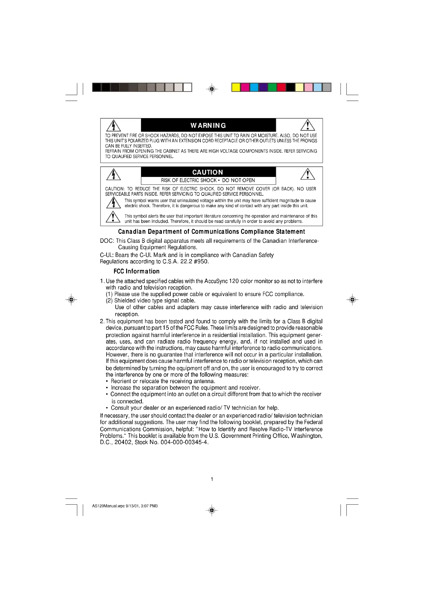 - Consult your dealer or an experienced radio/TV technician for help. If necessary, the user should contact the dealer or an experienced radio/television technician for additional suggestions. The user may find the following booklet, prepared by the Federal Communications Commission, helpful: ”How to Identify and Resolve Radio-TV Interference Problems.“ This booklet is available from the U.S. Government Printing Office, Washington, D.C., 20402, Stock No. 004-000-00345-4. AS120Manual.wpc 9/13/01, 3:07 PM32 Your new NEC AccuSync
