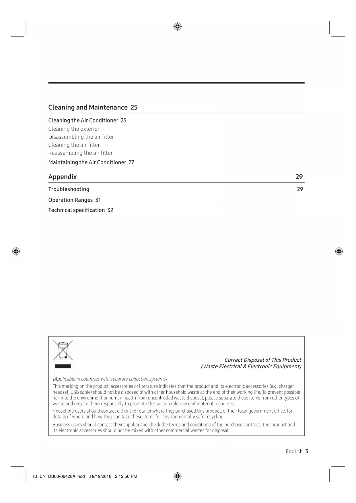 Troubleshooting 29 Operation Ranges 31 Technical specification 32 Correct Disposal of This Product (Waste Electrical & Electronic Equipment) (Applicable in countries with separate collection systems) This marking on the product, accessories or literature indicates that the product and its electronic accessories (e.g. charger, headset, USB cable) should not be disposed of with other household waste at the end of their working life. To prevent possible harm to the environment or human health from uncontrolled waste disposal, please separate these items from other types of waste and recycle them responsibly to promote the sustainable reuse of material resources. Household users should contact either the retailer where they purchased this product, or their local government office, for details of where and how they can take these items for environmentally safe recycling. Business users should contact their supplier and check the terms and conditions of the purchase contract. This product and its electronic accessories should not be mixed with other commercial wastes for disposal.IB_EN_DB68-06428A.indd 3 9/19/2016 2:12:56 PM4 EnglishSafety Information Safety Information Before using your new air conditioner, please read this manual thoroughly to ensure that you know how to safely and efficiently operate the extensive features and functions of your new appliance. Because the following operating instructions cover various models, the characteristics of your air conditioner may differ slightly from those described in this manual. If you have any questions, call your nearest contact centre or find help and information online at www.samsung.com. WARNING Hazards or unsafe practices that may result in severe personal injury or death. CAUTION Hazards or unsafe practices that may result in minor personal injury or property damage. Follow directions. Do NOT attempt. Make sure the machine is grounded to prevent electric shock. Cut off the power supply. Do NOT disassemble. FOR INSTALLATION WARNING Use the power line with the power specifications of the product or higher and use the power line for this appliance only. In addition, do not use an extension line.