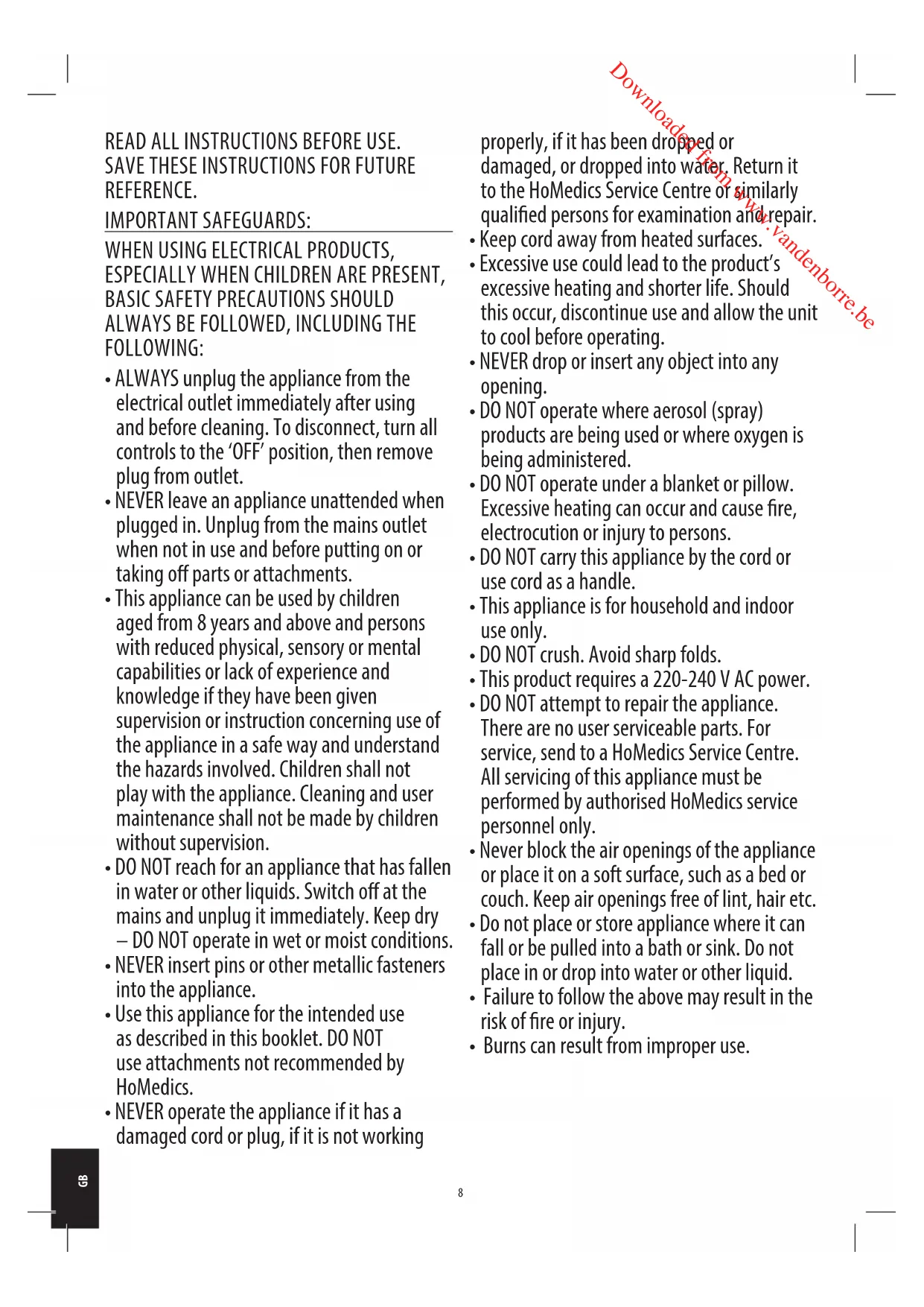 - Use this appliance for the intended use as described in this booklet. DO NOT use attachments not recommended by HoMedics.