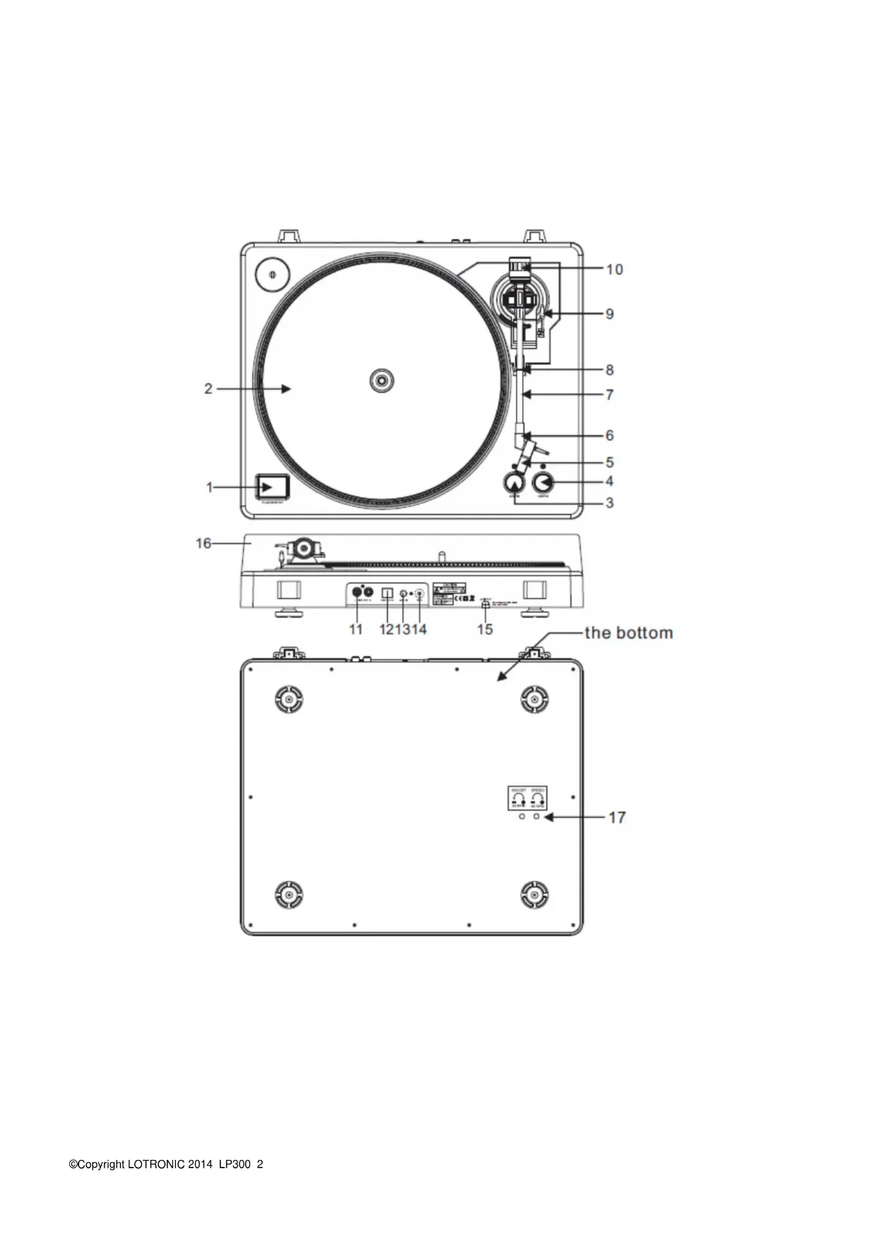 Audio input for connection of an iPod, MP2 player, etc. to a PC. 14– Ground Ground lug for turntable connection. Always use this connection when using turntables (your turntable cable should have a grounding wire). 15– Power cable This power cable should be plugged into a wall receptacle AFTER all audio connections have been made. Description©Copyright LOTRONIC 2014 LP300 5 16– Dust cover Close the dust cover when not in use to protect the unit against dust. Open and remove during use. 17– Adjustments The unit has already been adjusted at works. However if you need to adjust the rotation speed, use these controls.