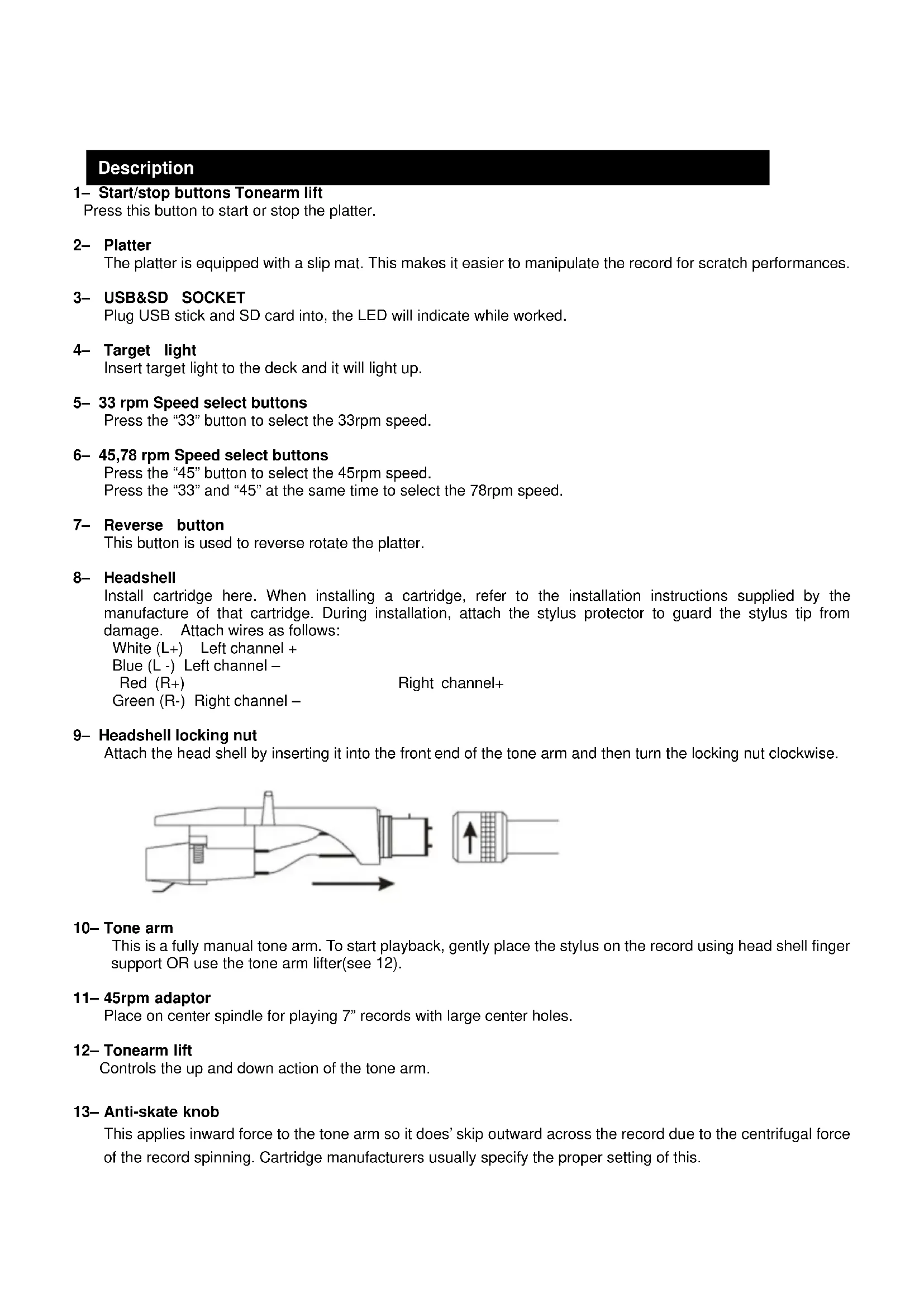 Plug USB stick and SD card into, the LED will indicate while worked. 4– Target light Insert target light to the deck and it will light up. 5– 33 rpm Speed select buttons Press the “33” button to select the 33rpm speed. 6– 45,78 rpm Speed select buttons Press the “45” button to select the 45rpm speed. Press the “33” and “45” at the same time to select the 78rpm speed. 7– Reverse button This button is used to reverse rotate the platter. 8– Headshell Install cartridge here. When installing a cartridge, refer to the installation instructions supplied by the manufacture of that cartridge. During installation, attach the stylus protector to guard the stylus tip from damage. Attach wires as follows: White (L+) Left channel + Blue (L -) Left channel – Red (R+) Right channel+ Green (R-) Right channel – 9– Headshell locking nut Attach the head shell by inserting it into the front end of the tone arm and then turn the locking nut clockwise.
