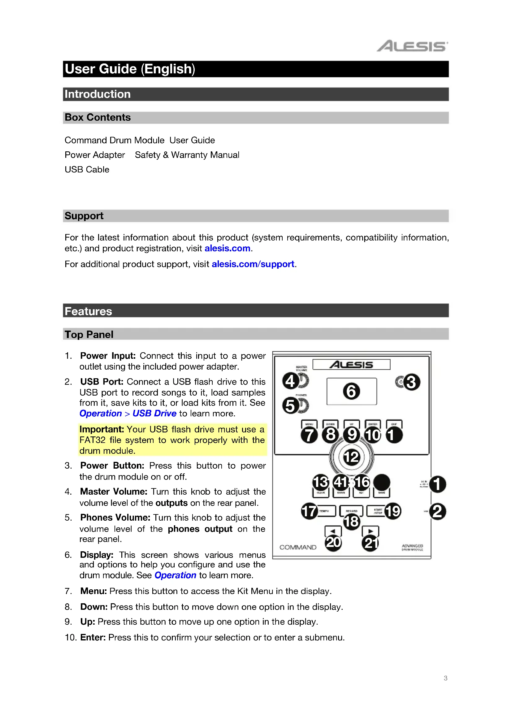 Support For the latest information about this product (system requirements, compatibility information, etc.) and product registration, visit alesis.com. For additional product support, visit alesis.com/support.