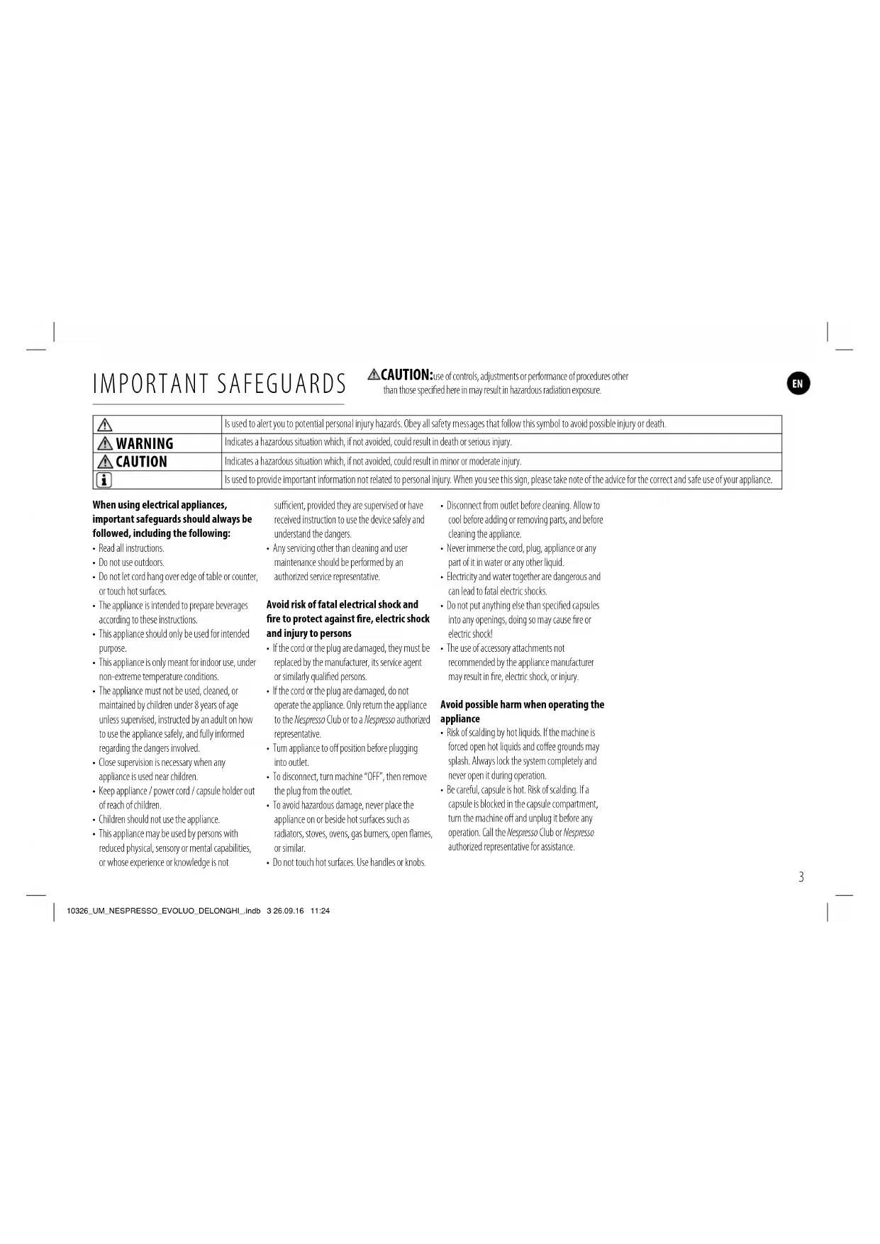 - Be careful, capsule is hot. Risk of scalding. If a capsule is blocked in the capsule compartment, turn the machine o and unplug it before any operation. Call the Nespresso Club or Nespresso authorized representative for assistance. Is used to alert you to potential personal injury hazards. Obey all safety messages that follow this symbol to avoid possible injury or death. WARNING Indicates a hazardous situation which, if not avoided, could result in death or serious injury. CAUTION Indicates a hazardous situation which, if not avoided, could result in minor or moderate injury. Is used to provide important information not related to personal injury. When you see this sign, please take note of the advice for the correct and safe use of your appliance. CAUTION: use of controls, adjustments or performance of procedures other than those specied here in may result in hazardous radiation exposure. 10326_UM_NESPRESSO_EVOLUO_DELONGHI_.indb 3 26.09.16 11:24FR