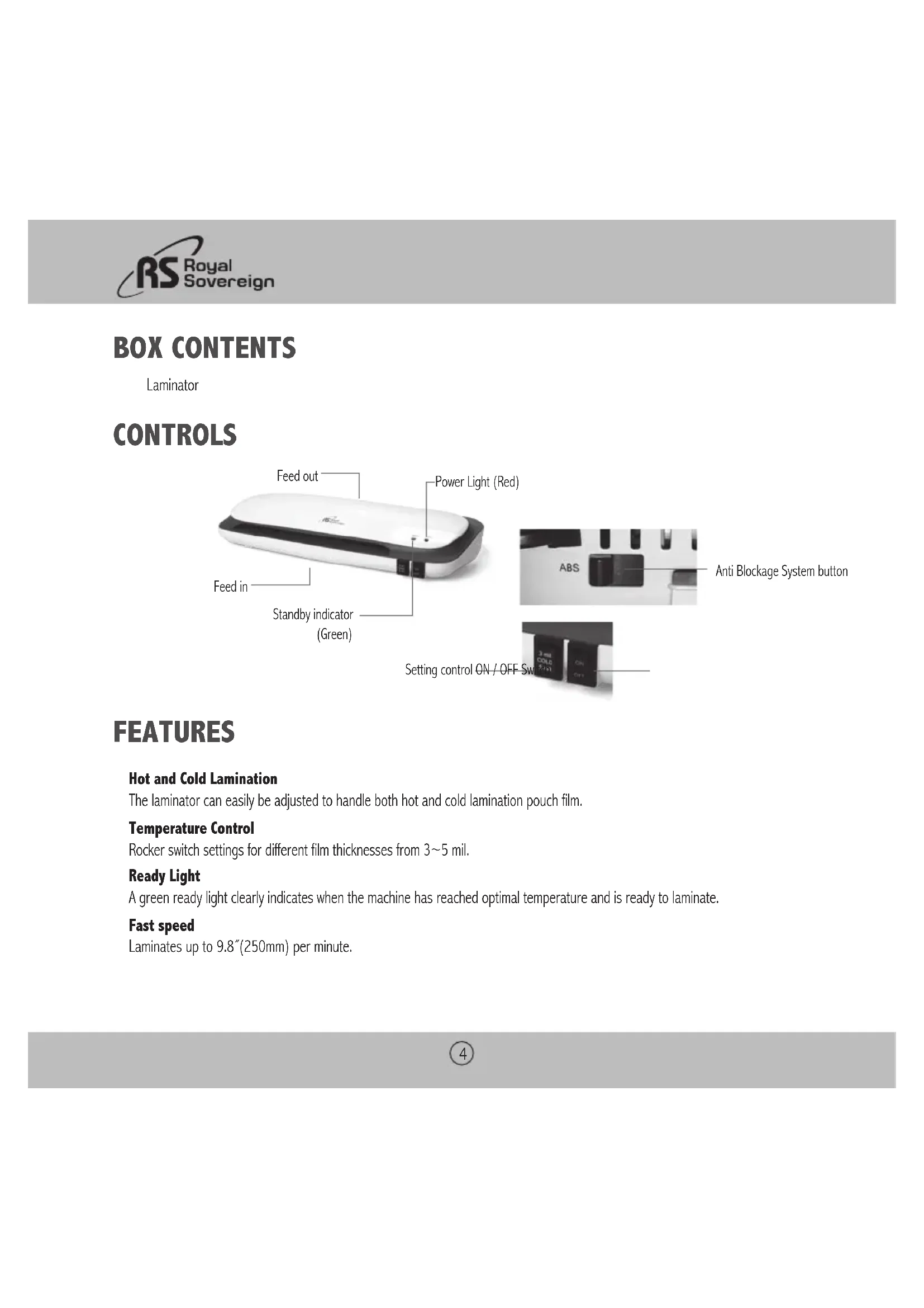 CONTENTS Box Contents 4 Parts 4 Controls 4 Features 4 Operation 5 Troubleshooting 6 Specifications 7 Warranty 8 Contact Information 8 Página en Español 9 Page en Français 174 BOX CONTENTS Laminator CONTROLS FEATURES Hot and Cold Lamination The laminator can easily be adjusted to handle both hot and cold lamination pouch film. Temperature Control Rocker switch settings for different film thicknesses from 3~5 mil. Ready Light A green ready light clearly indicates when the machine has reached optimal temperature and is ready to laminate. Fast speed Laminates up to 9.8˝(250mm) per minute. Standby indicator (Green) Power Light (Red) Feed in Feed out Anti Blockage System button Setting control ON / OFF SwitchCS-923/1223