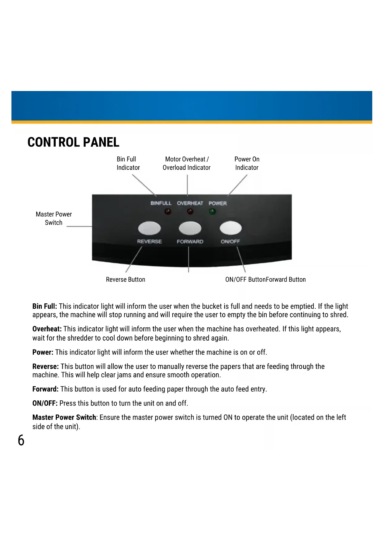 Master Power SwitchCONTROL PANEL Bin Full: This indicator light will inform the user when the bucket is full and needs to be emptied. If the light appears, the machine will stop running and will require the user to empty the bin before continuing to shred. Overheat: This indicator light will inform the user when the machine has overheated. If this light appears, wait for the shredder to cool down before beginning to shred again. Power: This indicator light will inform the user whether the machine is on or off. Reverse: This button will allow the user to manually reverse the papers that are feeding through the machine. This will help clear jams and ensure smooth operation. Forward: This button is used for auto feeding paper through the auto feed entry. ON/OFF: Press this button to turn the unit on and off. Master Power Switch: Ensure the master power switch is turned ON to operate the unit (located on the left side of the unit). Reverse Button ON/OFF ButtonForward Button Bin Full Indicator Power On Indicator Motor Overheat / Overload Indicator