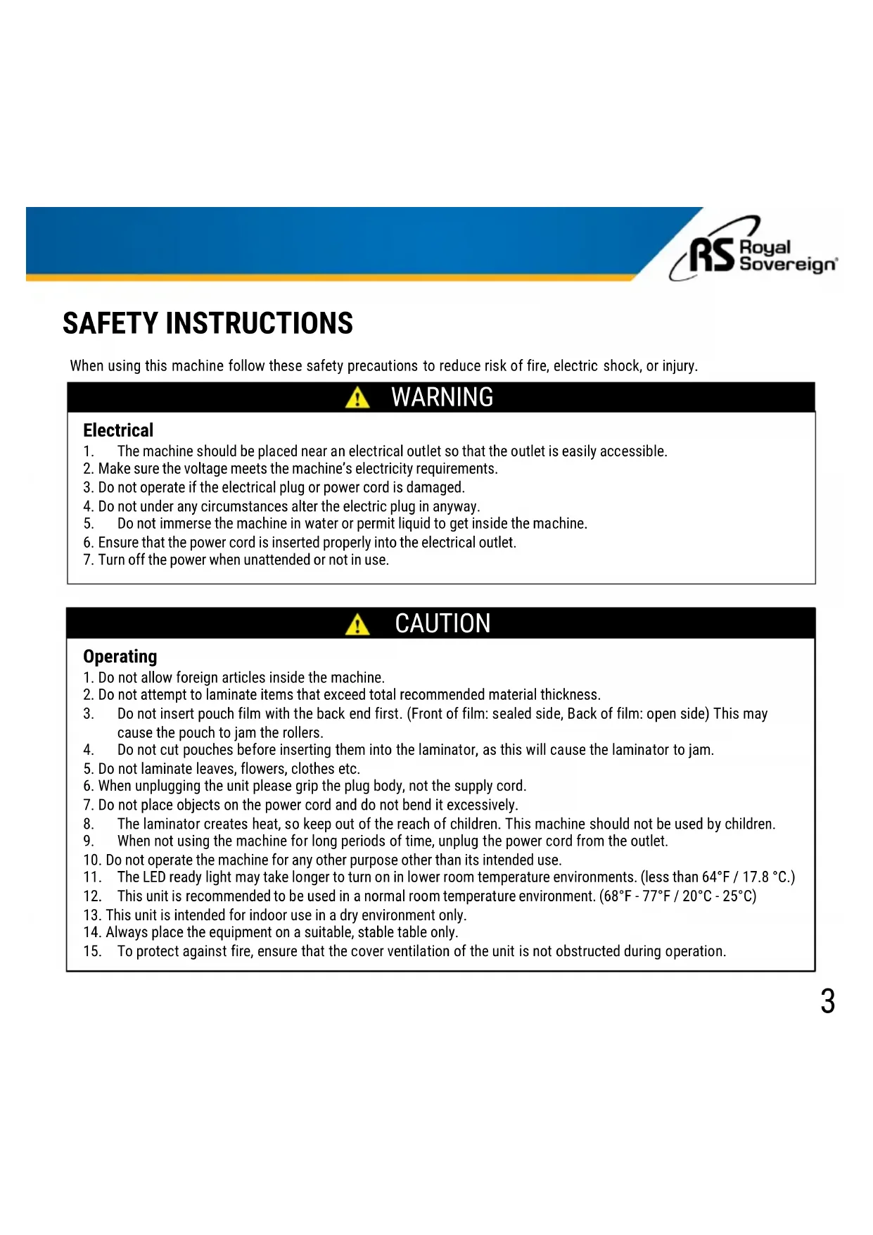 Power Supply Voltage 120V (60 Hz) 120V (60 Hz) Power Consumption (W) 500W 760W Number of Rollers 2 2 Speed 18.9 in. (480 mm) per minute 18.9 in. (480 mm) per minute Maximum Entry Width 9 in. (230 mm) 13 in. (330 mm) Pouch Mil. Thickness 3 Mil. – 5 Mil. 3 Mil. – 5 Mil. Warm-up Time 60 seconds 60 seconds Unit Dimensions (W x D x H) 13.58” x 4.13” x 2.95” 345 mm x 105 mm x 75 mm 17.10” x 4.13” x 2.95” 435 mm x 105 mm x 75 mm Unit Weight 2.65 lbs. (1.2 kg) 3.88 lbs. (1.76 kg) Certification cTUVus cTUVus SPECIFICATIONSRoyal Sovereign International, Inc. warranties this product to be free from defects in material and workmanship for a period of one (1) year. This warranty is extended to the original purchaser only. This warranty only covers products that are properly installed, properly maintained, and properly operated in accordance with the instructions provided. This limited warranty does not cover any failures or operating difficulties due to normal wear and tear, accident, abuse, misuse, alteration, misapplication, improper installation, or improper maintenance and service by you or any third party. Returned product will not be accepted without a Return Authorization number. To request a Return Authorization number, please visit us at www.royalsovereign.com. All transportation costs for the return of damaged product or parts will be the responsibility of the purchaser. Return defective product, in original packaging, to the address below. Royal Sovereign International, Inc. requires reasonable proof of your date of purchase from an authorized retailer or distributor. Therefore, you should keep your receipt, invoice, or canceled check from the original purchase. The limited warranty shall be limited to the repair or replacement of parts which prove defective under normal use and service within the warranty period. Royal Sovereign International, Inc. (and its affiliated companies) SHALL HAVE NO LIABILITY WHATSOEVER TO PURCHASER OR ANY THIRD PARTY FOR ANY SPECIAL, INDIRECT, PUNITIVE, INCIDENTAL,OR CONSEQUENTIAL DAMAGES. Some states do not allow the exclusion or limitation of incidental or consequential damages so the above exclusion and limitations may not apply to you. For product support and warranty questions, please visit us at www.royalsovereign.com/CustomerSupport ROYAL SOVEREIGN INTERNATIONAL, INC. 2 Volvo Dr., Rockleigh, NJ 07647 USA