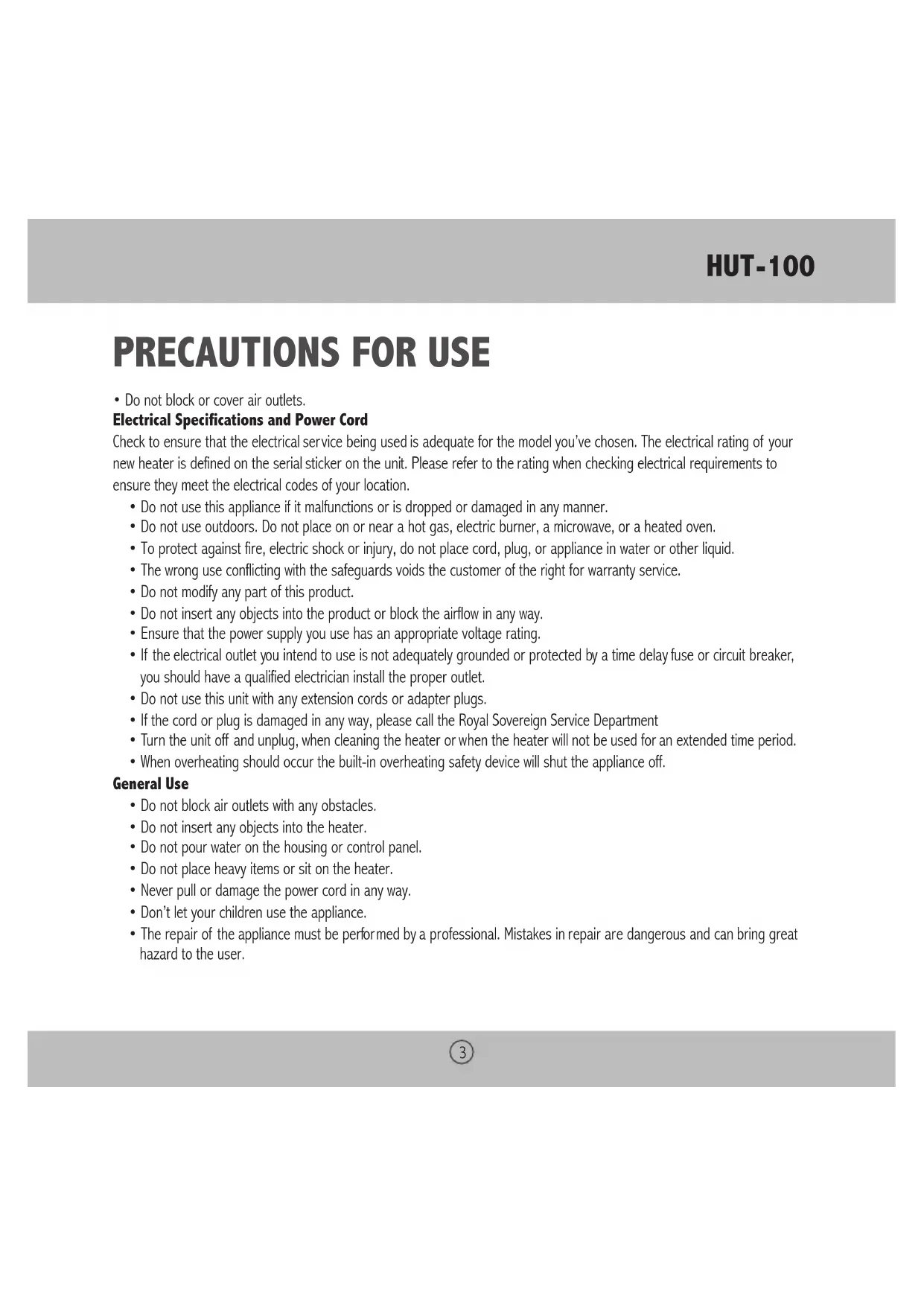 Download the instructions for your Heating in PDF format for free! Find your manual HUT100 - Royal Sovereign and take your electronic device back in hand. On this page are published all the documents necessary for the use of your device. HUT100 by Royal Sovereign.