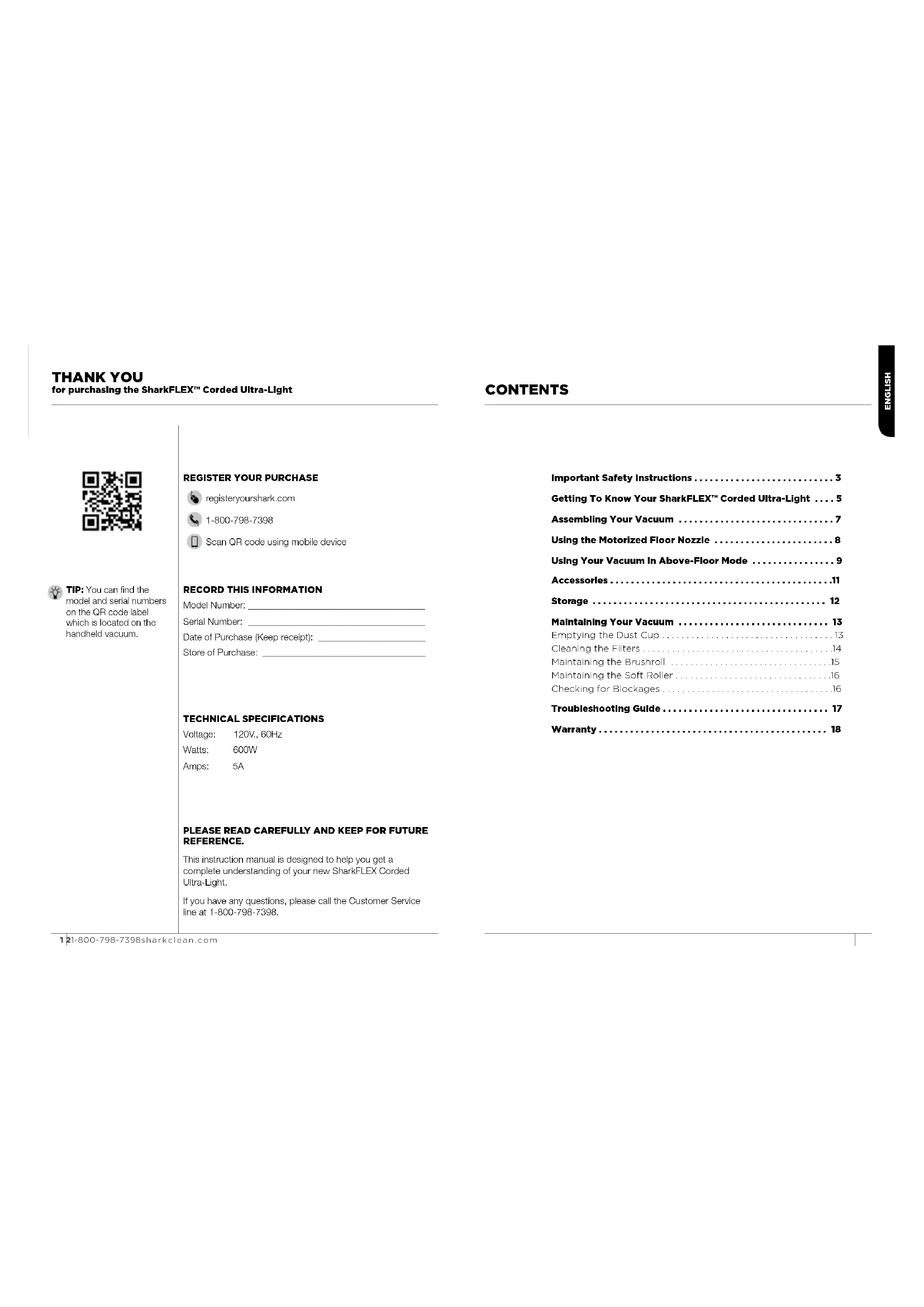 HV392 Series • Série • Serie INSTRUCTIONS INSTRUCCIONES sharkclean.com 1-800-798-7398 SharkFLEX TM/MC Corded Ultra-Light Ultra léger, à cordon électrique Ultraliviana concable1 21-800-798-7398 sharkclean.com ENGLISH CONTENTS THANK YOU for purchasing the SharkFLEX™ Corded Ultra-Light Important Safety Instructions 3 Getting To Know Your SharkFLEX™ Corded Ultra-Light 5 Assembling Your Vacuum 7 Using the Motorized Floor Nozzle 8 Using Your Vacuum in Above-Floor Mode 9 Accessories 11 Storage 12 Maintaining Your Vacuum 13 Emptying the Dust Cup 13 Cleaning the Filters 14 Maintaining the Brushroll 15 Maintaining the Soft Roller 16 Checking for Blockages 16 Troubleshooting Guide 17 Warranty 18 PLEASE READ CAREFULLY AND KEEP FOR FUTURE REFERENCE This instruction manual is designed to help you get a complete understanding of your new SharkFLEX Corded Ultra-Light. If you have any questions, please call the Customer Service line at 1-800-798-7398. TECHNICAL SPECIFICATIONS Voltage: 120V., 60Hz Watts: 600W Amps: 5A TIP: You can find the model and serial numbers on the QR code label which is located on the handheld vacuum.