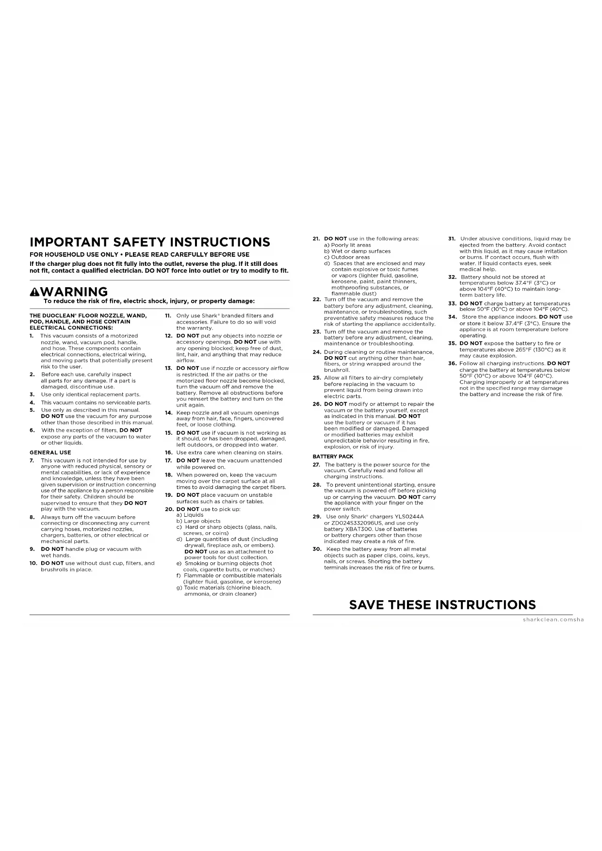 29. Use only Shark® chargers YLS0244A