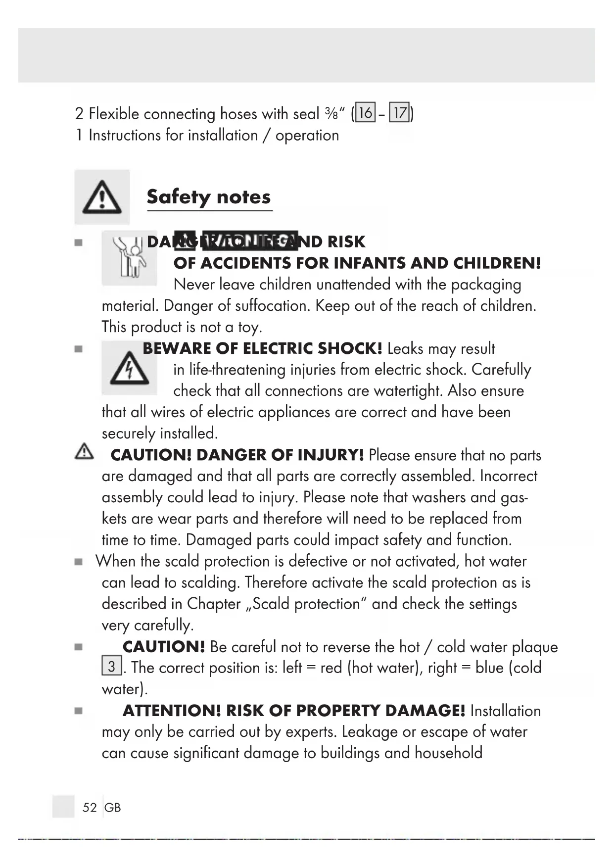 OF ACCIDENTS FOR INFANTS AND CHILDREN! Never leave children unattended with the packaging material. Danger of suffocation. Keep out of the reach of children. This product is not a toy. BEWARE OF ELECTRIC SHOCK! Leaks may result in life-threatening injuries from electric shock. Carefully check that all connections are watertight. Also ensure that all wires of electric appliances are correct and have been securely installed. CAUTION! DANGER OF INJURY! Please ensure that no parts are damaged and that all parts are correctly assembled. Incorrect assembly could lead to injury. Please note that washers and gas- kets are wear parts and therefore will need to be replaced from time to time. Damaged parts could impact safety and function. When the scald protection is defective or not activated, hot water can lead to scalding. Therefore activate the scald protection as is described in Chapter „Scald protection“ and check the settings very carefully. CAUTION! Be careful not to reverse the hot / cold water plaque