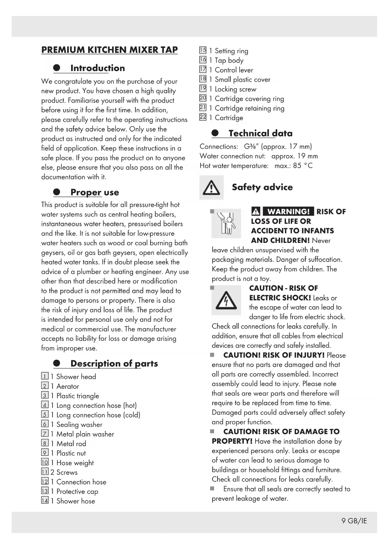 PROPERTY! Have the installation done by experienced persons only. Leaks or escape of water can lead to serious damage to buildings or household fittings and furniture. Check all connections for leaks carefully. Ensure that all seals are correctly seated to prevent leakage of water.10 GB/IE The spout can be swiveled to your desired position. Make sure the spout is always positioned within the area of the sink, otherwise escape of water can lead to serious flooding to your house or building. CAUTION! DANGER OF SCALDING! When making the hot water setting please ensure that the temperature of the water is not too high. Before installation, make yourself familiar with all the existing services, e.g. water connection and stopcocks. Please read carefully through these operating instructions before installing and using the product. Keep all the safety advice and instructions in a safe place for future reference! Installation Installing the tap Turn off the main water supply to prevent serious leakage of water. Allow any remaining water in the pipework to drain. Install the tap as shown in Figs. A to F. m CAUTION! Do not bend the hoses or place them under tension. Otherwise material damage could result. Flushing the tap The tap must be flushed through before first use to remove any dirt. To do this, follow these steps (see Fig. H): Screw the aerator