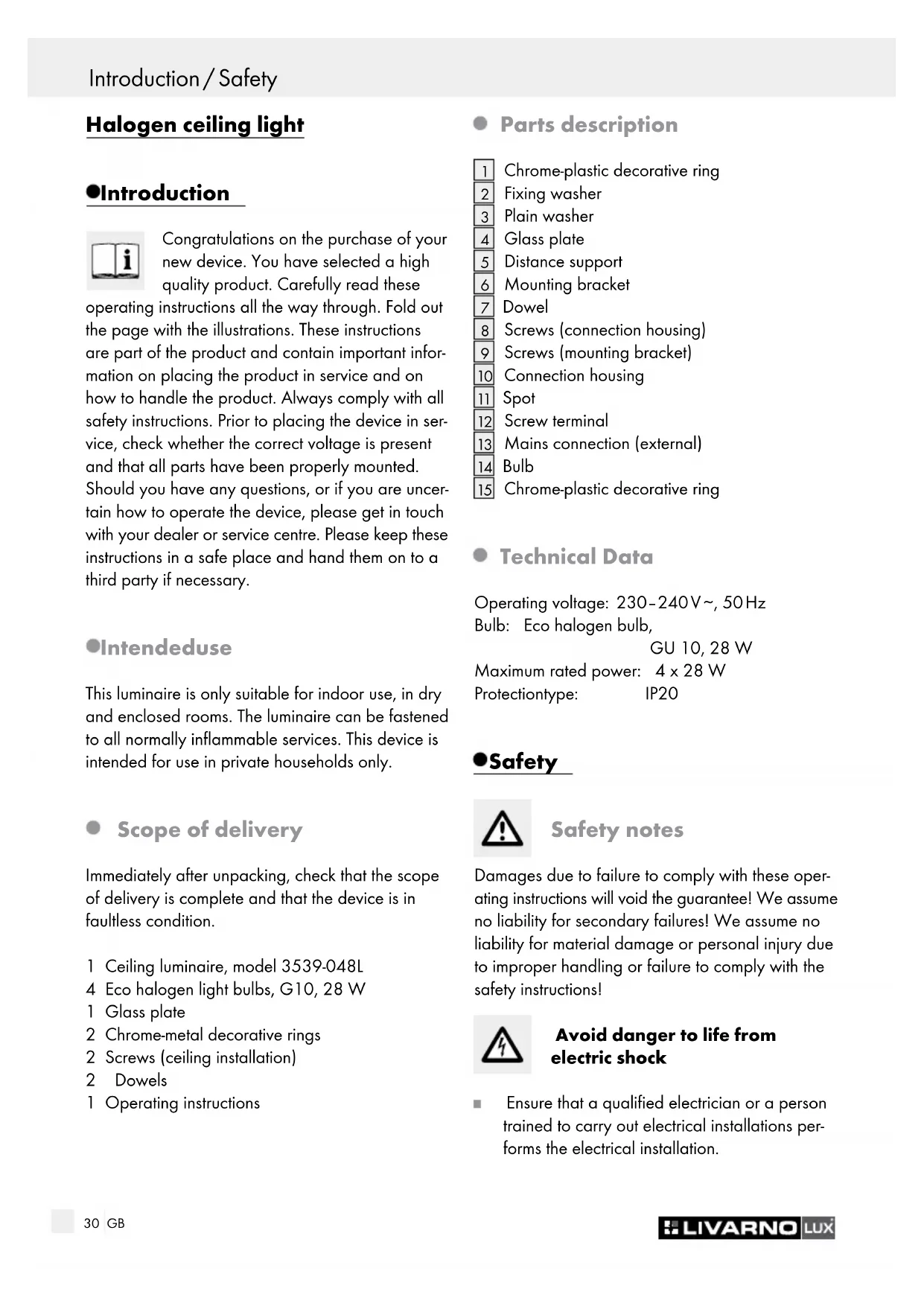 Chrome-plastic decorative ring Technical Data Operating voltage: 230–240 V ∼, 50 Hz Bulb: Eco halogen bulb, GU 10, 28 W Maximum rated power: 4 x 28 W Protection type: IP20 Safety Safety notes Damages due to failure to comply with these oper- ating instructions will void the guarantee! We assume no liability for secondary failures! We assume no liability for material damage or personal injury due to improper handling or failure to comply with the safety instructions! Avoid danger to life from electric shock Ensure that a qualified electrician or a person trained to carry out electrical installations per- forms the electrical installation.31 GB Always check the luminaire, the power supply, and the mains cable for damage before plug- ging it in. Never use the luminaire if it shows any signs of damage. CAUTION! A damaged mains cable means life-threatening danger due to electric shock. In the event of damage, repairs or other problems with the luminaire, contact the service centre or a qualified electrician. Before installation, remove the fuse or switch off the circuit breaker (0 setting) in the fuse box. Before mounting, ensure that the available mains voltage corresponds to the operating voltage required for the luminaire (230–240 V ∼). Strictly avoid the luminaire from coming into contact with water or other liquids. Never open a component of the electrical equipment or insert anything into a component of the electrical equipment. Such interventions pose life-threatening danger due to electric shock. Do not install the luminaire on a wet or conduc- tive substrate! Avoid fire hazards and injury hazards RISK OF INJURY! Check every bulb and lamp lens for damage immediately upon unpacking. Do not mount the luminaire with defective bulbs and / or lamp lenses. In this case contact the service centre for replacement. RISK OF INJURY FROM BURNS! Ensure that the luminaire has been switched off and has cooled before touching it, to avoid burn injuries. Bulbs develop a lot of heat in the area of the lamp holder. Allow the luminaire to cool completely. Replace faulty bulbs with new bulbs immediately. Before replacing the bulb, always remove the fuse or switch off the circuit breaker, first. 0,5 m FIRE HAZARD! Mount the lumi- naire so that it is at least 0.5 m away from the materials to be illuminated. Excessive heat can result in a fire. Do not leave the luminaire or packaging mate- rial unattended. Plastic film or bags, plastic parts etc. can become dangerous playthings for children. Working safely Only use 220–240 V ∼ eco halogen light bulbs with a G10 base and a maximum output of 28 Watts. Mount the luminaire so that it is protected from moisture and dirt. Make careful preparations for mounting and take sufficient time. Clearly lay out all compo- nents and any additional tools or materials that may be required so that they are readily to hand. Remain alert at all times and always watch what you are doing! Always pay attention to what you are doing and act with common sense. Do not, under any circumstances, install the lumi- naire if you are having difficulty concentrating or do not feel well. Preparation Required tools and material The tools and materials cited are not included in the scope of delivery. This information and these values are non-binding and are provided for pur- poses of orientation. The condition of the material is determined by the individual local conditions. - Pencil / marking tool - Voltage tester - Screwdriver - Electric drill - Drill (ø 6 mm) - Side cutting pliers - Ladder Prior to installation Important: The electrical connection must be carried out by a qualified electrician or someone trained to perform electrical installations. This Safety / Preparation / Prior to installation32 GB Prior to installation / Mounting / Adjusting the lamp / Changing the bulb person must be familiar with the characteristics of the luminaire and connection regulations. Familiarise yourself with all instructions and diagrams in this manual, as well as with the luminaire before installation. Before installation, ensure that the cable that the luminaire will be attached to is de-energised. To do this, remove the fuse or switch off the circuit breaker in the fuse box (0 position). Use the voltage tester to verify de-energised status. Mounting Fix the chrome-plastic decorative rings