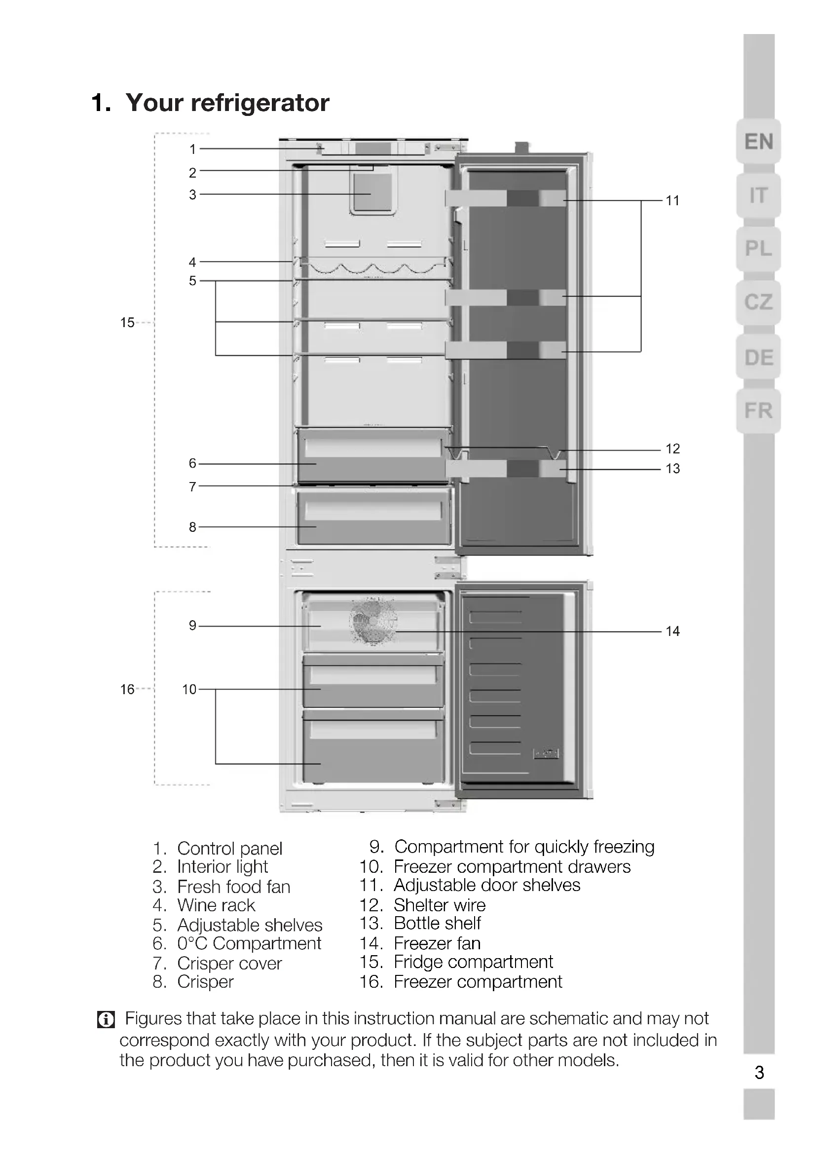 prevent the water spilling on the electric installation or on the floor. B) Freezer compartment The NO FROST type defrost is completely automatic. No intervention from your side is required. The water is collected on the compressor tray. Due the heat of the compressor the water is evaporated. Warnings! The fans inside the freezer and fresh food compartments circulates cold air. Never insert any object through the guard. Do not allow children to play with the fresh food and freezer fan. Never store products that contain inflammable propellant gas (e.g. dispensers, spray cans etc.) or explosive substances. Don’t cover the shelves with any protective materials, which may obstruct air circulation. Do not allow children to play with the appliance or tamper with the controls. Do not obstruct the fan guards to ensure that you obtain the best possible performance from your appliance. Please ensure the fans are not blocked (stopped) or impaired by food or packaging. Blocking (stopping) or impairing the fan can result in an increase of the internal freezer temperature (Thawing). Zero temperature compartment This compartment has been designed to store frozen food which would be thawed slowly (meat, fish, chicken, etc.) as required. Zero temperature compartment is the coldest place of your refrigerator in which dairy products (cheese, butter), meat, fish or chicken may be kept at ideal storage conditions. Vegetables and/or fruits must not be placed in this compartment. 12EN