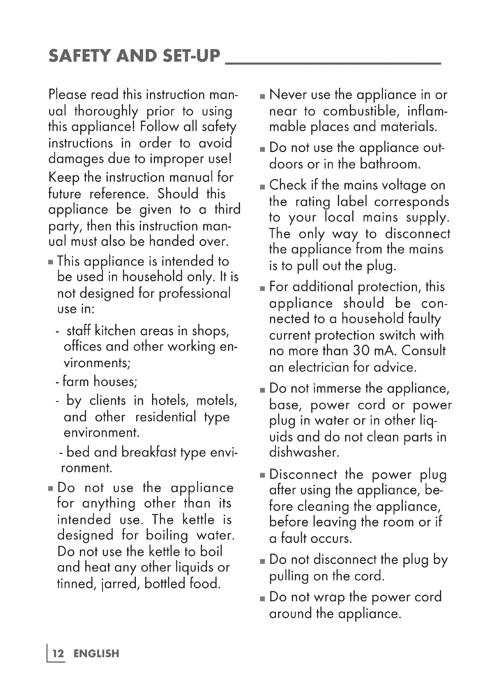 Do not use the appliance for anything other than its intended use. The kettle is designed for boiling water. Do not use the kettle to boil and heat any other liquids or tinned, jarred, bottled food.