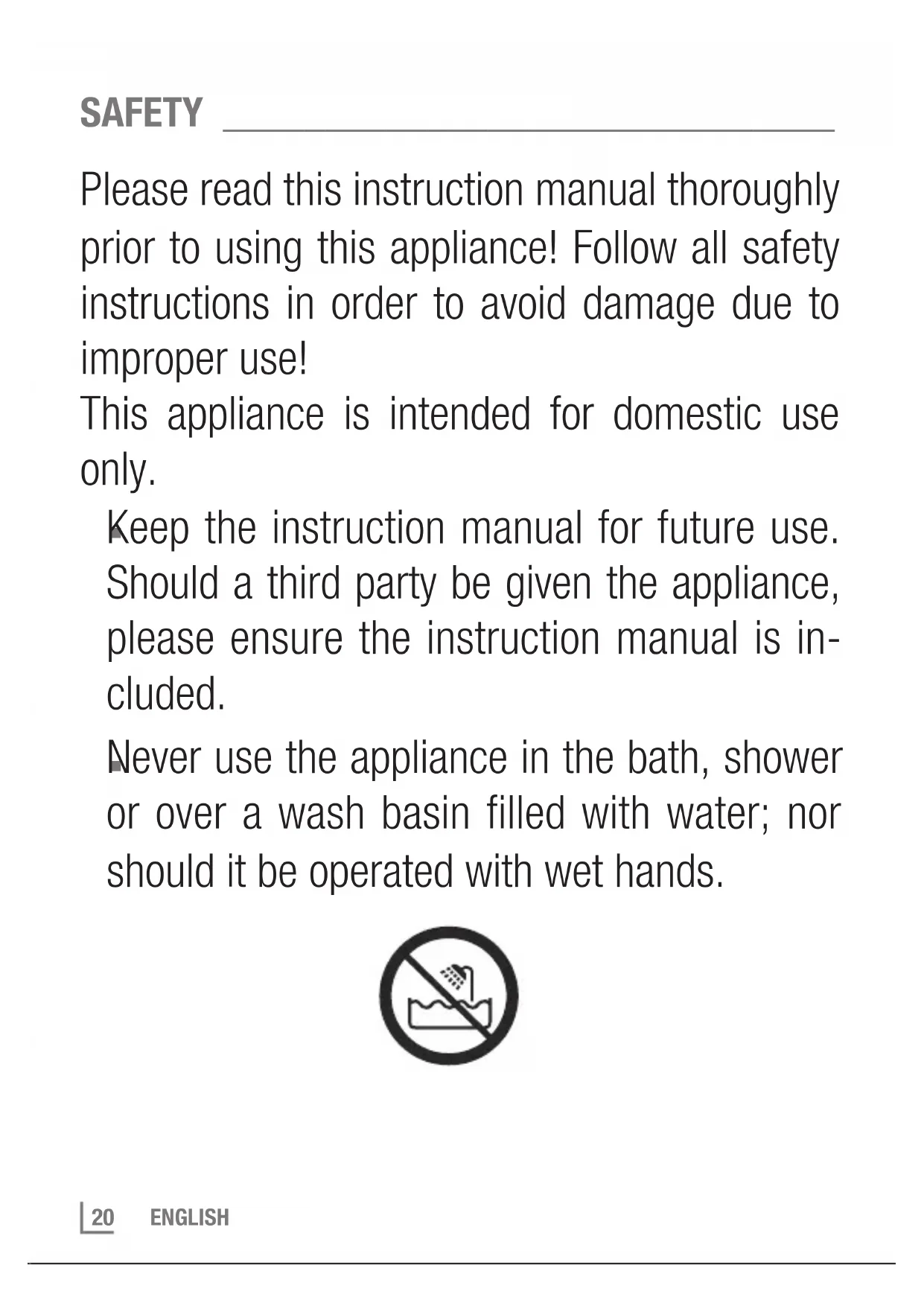 Never use the appliance in the bath, shower or over a wash basin filled with water; nor should it be operated with wet hands.ENGLISH