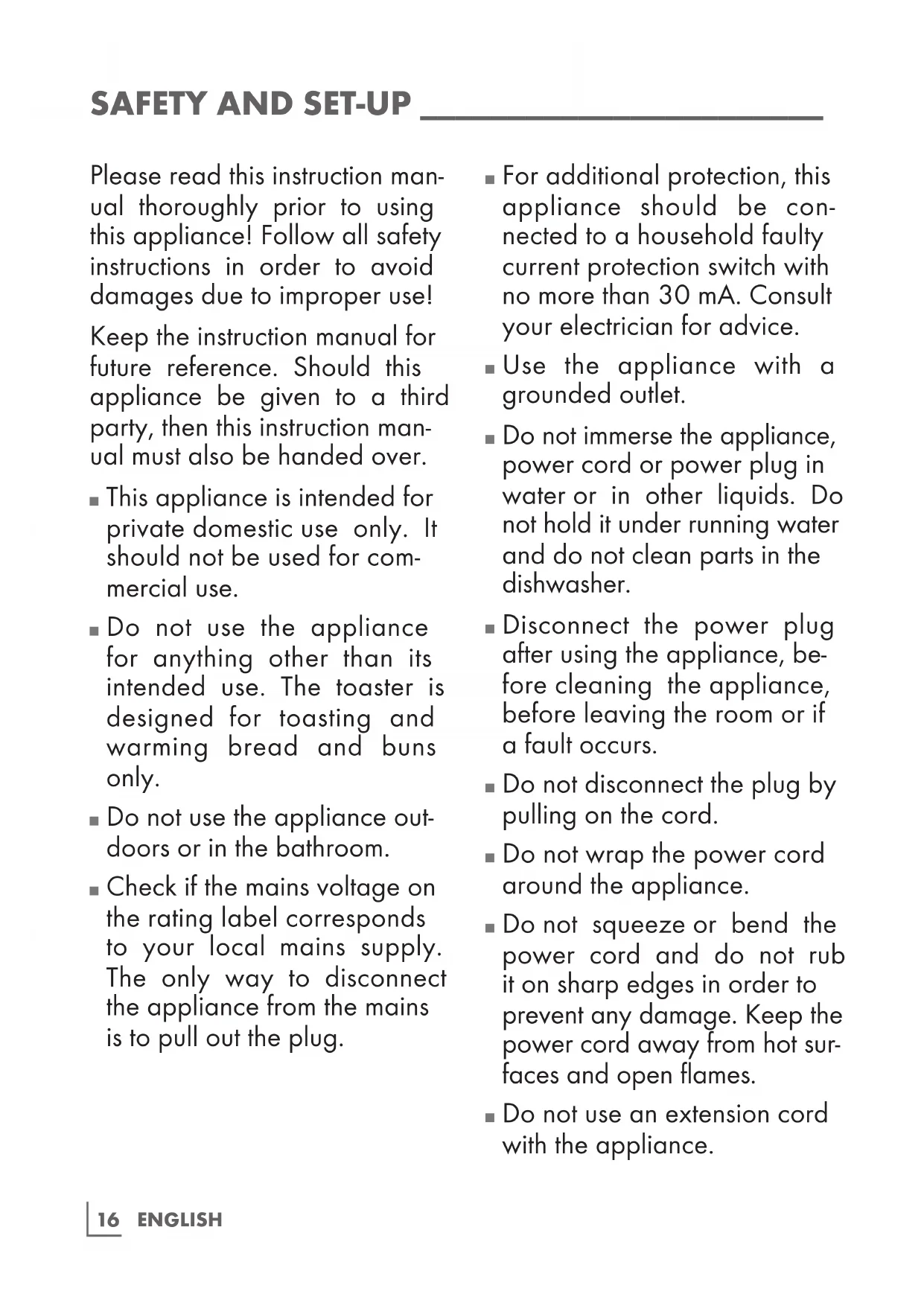 Do not use the appliance for anything other than its intended use. The toaster is designed for toasting and warming bread and buns only.