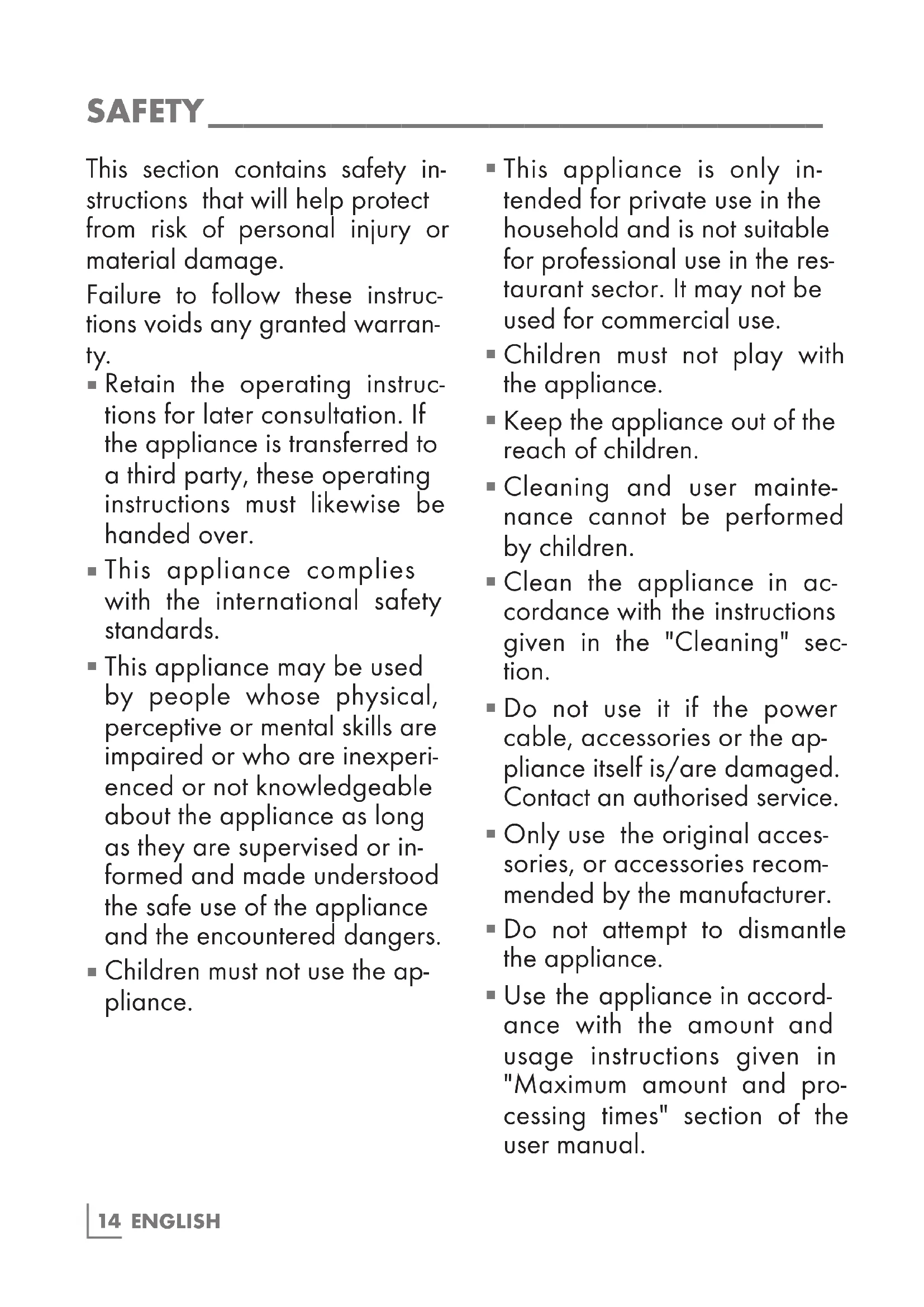Use the appliance in accord- ance with the amount and usage instructions given in "Maximum amount and pro- cessing times" section of the user manual. SAFETY ___________________________________ENGLISH 15