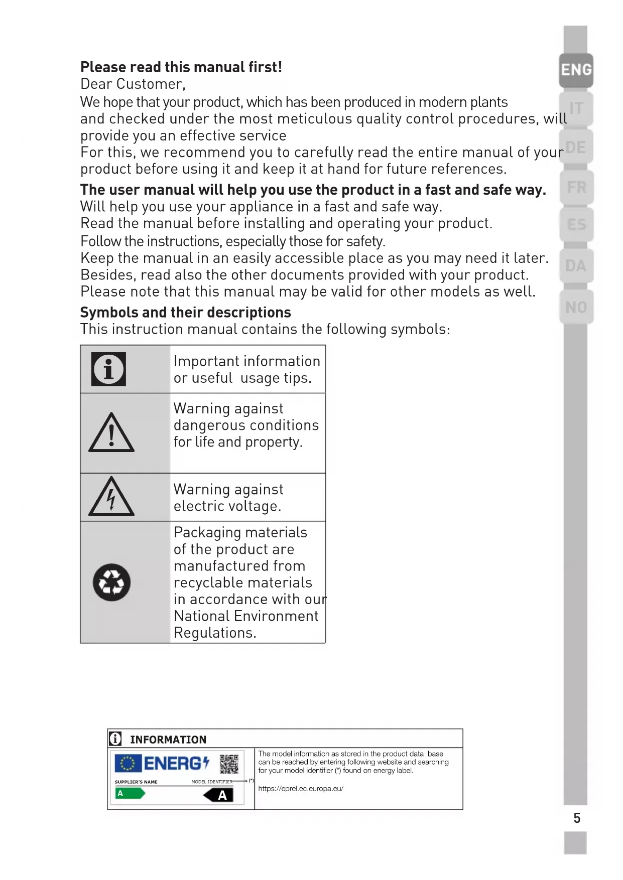 Please read this manual first! Dear Customer, We hope that your product, which has been produced in modern plants and checked under the most meticulous quality control procedures, will provide you an effective service For this, we recommend you to carefully read the entire manual of your product before using it and keep it at hand for future references. The user manual will help you use the product in a fast and safe way. Will help you use your appliance in a fast and safe way. Read the manual before installing and operating your product. Follow the instructions, especially those for safety. Keep the manual in an easily accessible place as you may need it later. Besides, read also the other documents provided with your product. Please note that this manual may be valid for other models as well. Symbols and their descriptions This instruction manual contains the following symbols: