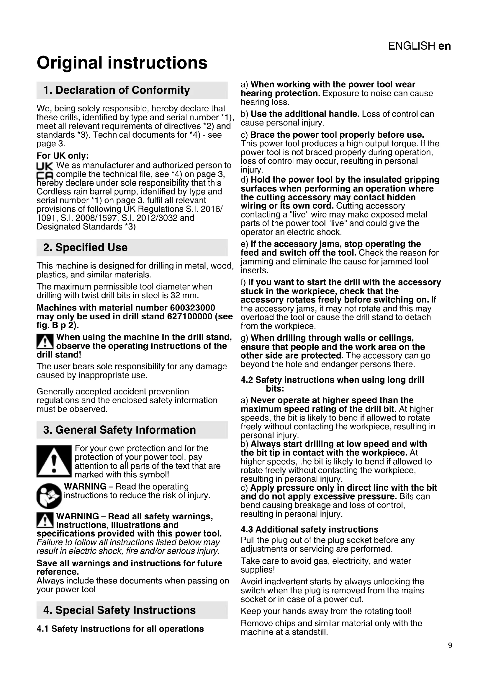 Original instructions We, being solely responsible, hereby declare that these drills, identified by type and serial number *1), meet all relevant requirements of directives *2) and standards *3). Technical documents for *4) - see page 3. For UK only: We as manufacturer and authorized person to compile the technical file, see *4) on page 3, hereby declare under sole responsibility that this Cordless rain barrel pump, identified by type and serial number *1) on page 3, fulfil all relevant provisions of following UK Regulations S.I. 2016/ 1091, S.I. 2008/1597, S.I. 2012/3032 and Designated Standards *3) This machine is designed for drilling in metal, wood, plastics, and similar materials. The maximum permissible tool diameter when drilling with twist drill bits in steel is 32 mm. Machines with material number 600323000 may only be used in drill stand 627100000 (see fig. B p 2). When using the machine in the drill stand, observe the operating instructions of the drill stand! The user bears sole responsibility for any damage caused by inappropriate use. Generally accepted accident prevention regulations and the enclosed safety information must be observed. For your own protection and for the protection of your power tool, pay attention to all parts of the text that are marked with this symbol! WARNING – Read the operating instructions to reduce the risk of injury. WARNING – Read all safety warnings, instructions, illustrations and specifications provided with this power tool. Failure to follow all instructions listed below may result in electric shock, fire and/or serious injury. Save all warnings and instructions for future reference. Always include these documents when passing on your power tool