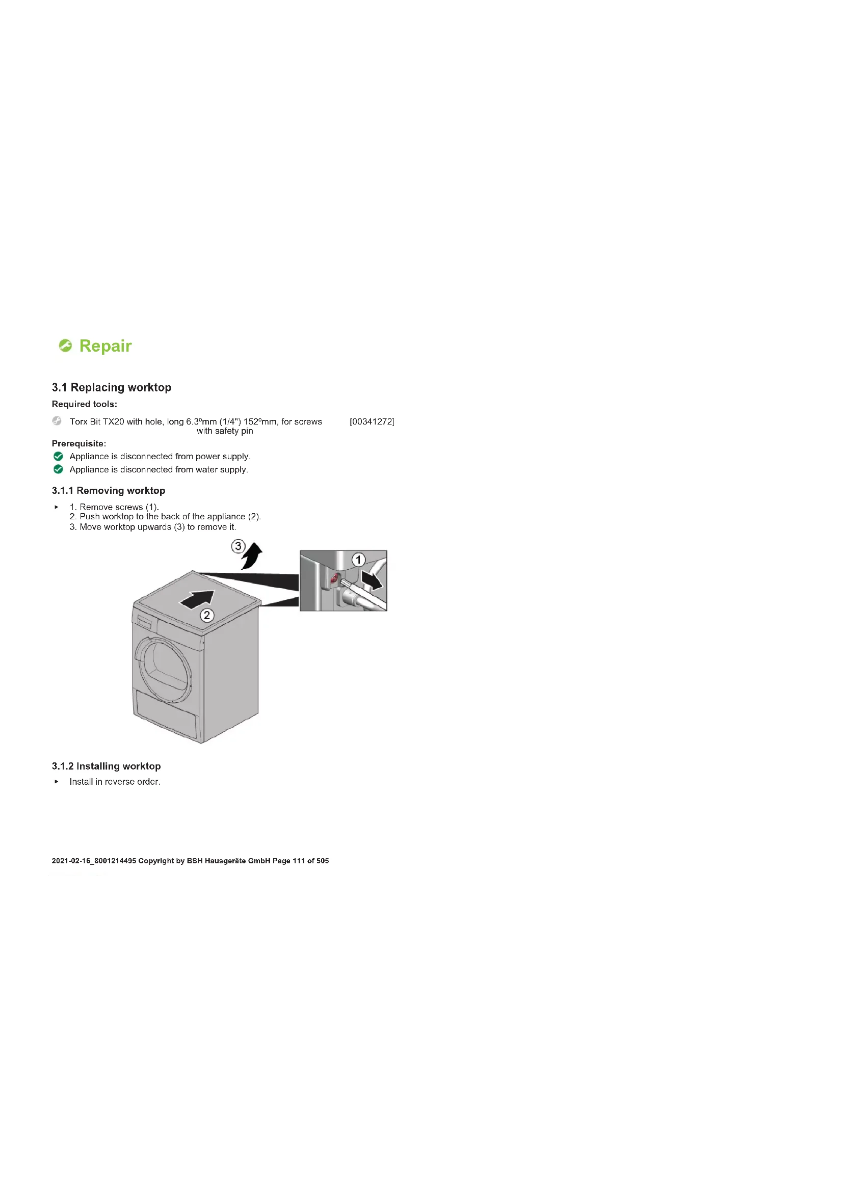Install in reverse order. Repair 2021-02-16_8001214495 Copyright by BSH Hausgeräte GmbH Page120of5053.8 Replacing door lock As a manufacturer, we are obliged to provide consumers with the spare part door lock including repair instructions in accordance with Regulation (EU) 2019/2023. However, we would like to point out that after replacing a door lock, an electrotechnical safety test by a qualified electrician is required before the device is put into operation. This person must be verifiably qualified according to the country-specific laws, regulations and standards. Danger Risk of electric shock due to live parts! Danger to life through electric shock in case of improper repair