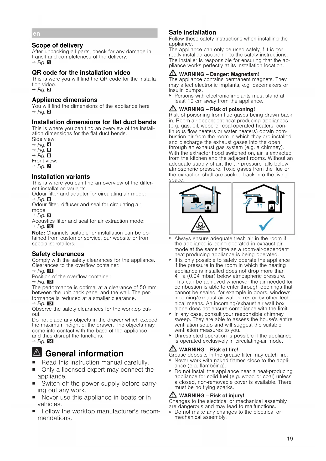 Persons with electronic implants must stand at least 10cm away from the appliance. WARNING‒Risk of poisoning! Risk of poisoning from flue gases being drawn back in. Room-air-dependent heat-producing appliances (e.g. gas, oil, wood or coal-operated heaters, con- tinuous flow heaters or water heaters) obtain com- bustion air from the room in which they are installed and discharge the exhaust gases into the open through an exhaust gas system (e.g. a chimney). With the extractor hood switched on, air is extracted from the kitchen and the adjacent rooms. Without an adequate supply of air, the air pressure falls below atmospheric pressure. Toxic gases from the flue or the extraction shaft are sucked back into the living space.