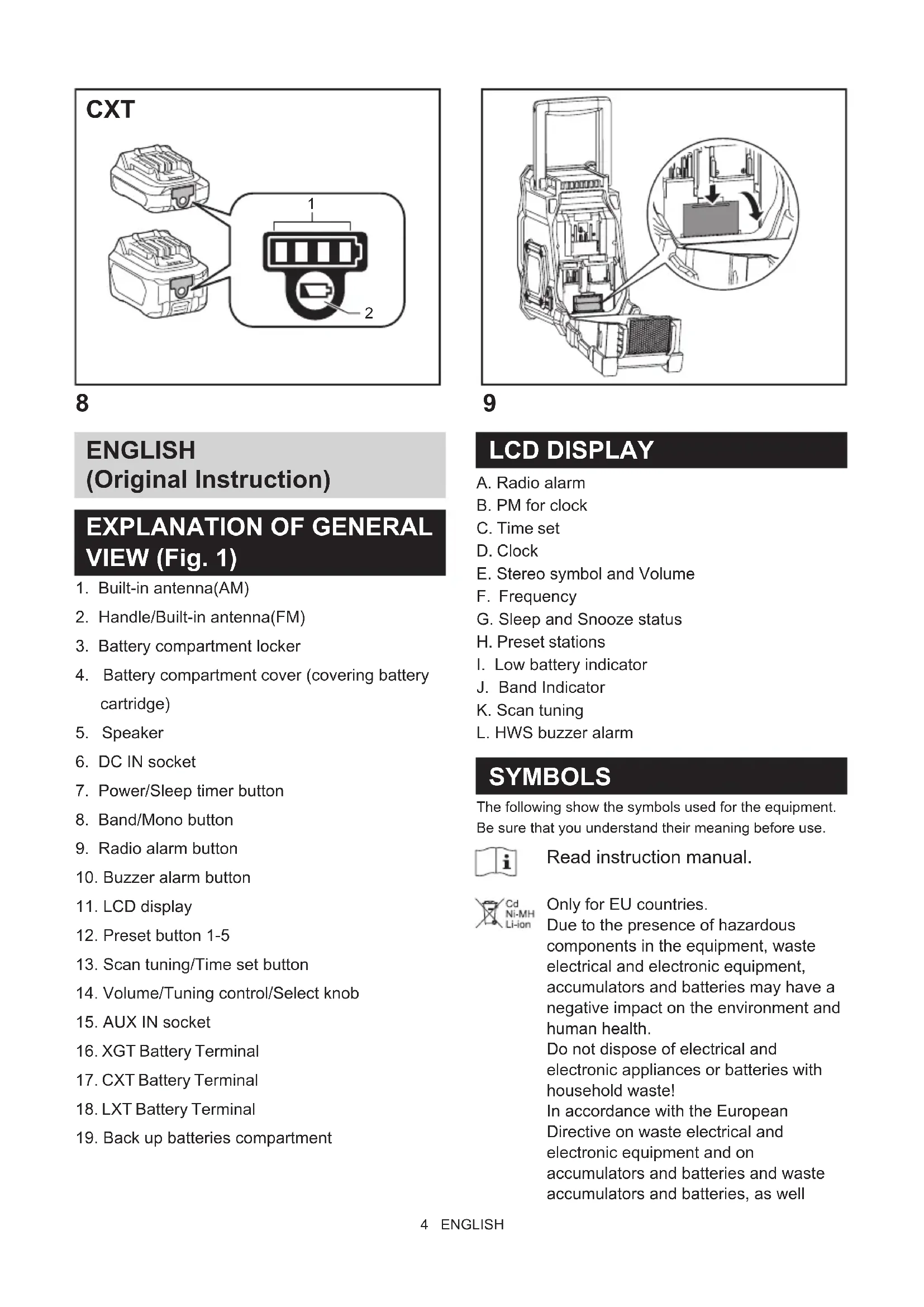 J. Band Indicator K. Scan tuning L. HWS buzzer alarm SYMBOLS The following show the symbols used for the equipment. Be sure that you understand their meaning before use. Read instruction manual. Only for EU countries. Due to the presence of hazardous components in the equipment, waste electrical and electronic equipment, accumulators and batteries may have a negative impact on the environment and human health. Do not dispose of electrical and electronic appliances or batteries with household waste! In accordance with the European Directive on waste electrical and electronic equipment and on accumulators and batteries and waste accumulators and batteries, as well