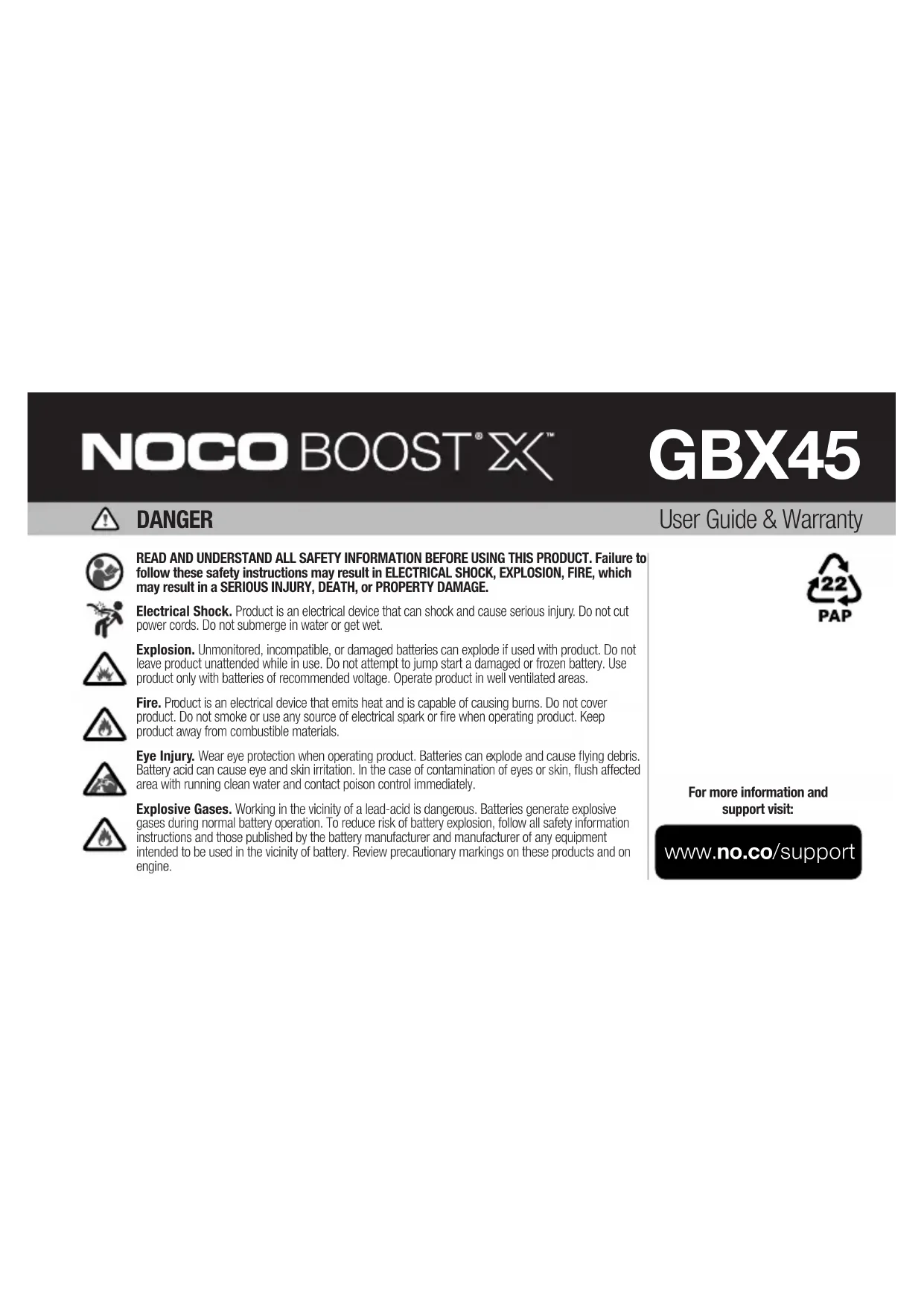 GBX45GBX45 www.no.co/support User Guide & Warranty DANGER READ AND UNDERSTAND ALL SAFETY INFORMATION BEFORE USING THIS PRODUCT. Failure to follow these safety instructions may result in ELECTRICAL SHOCK, EXPLOSION, FIRE, which may result in a SERIOUS INJURY, DEATH, or PROPERTY DAMAGE. Electrical Shock. Product is an electrical device that can shock and cause serious injury. Do not cut power cords. Do not submerge in water or get wet. Explosion. Unmonitored, incompatible, or damaged batteries can explode if used with product. Do not leave product unattended while in use. Do not attempt to jump start a damaged or frozen battery. Use product only with batteries of recommended voltage. Operate product in well ventilated areas. Fire. Product is an electrical device that emits heat and is capable of causing burns. Do not cover product. Do not smoke or use any source of electrical spark or fire when operating product. Keep product away from combustible materials. Eye Injury. Wear eye protection when operating product. Batteries can explode and cause flying debris. Battery acid can cause eye and skin irritation. In the case of contamination of eyes or skin, flush aected area with running clean water and contact poison control immediately. Explosive Gases. Working in the vicinity of a lead-acid is dangerous. Batteries generate explosive gases during normal battery operation. To reduce risk of battery explosion, follow all safety information instructions and those published by the battery manufacturer and manufacturer of any equipment intended to be used in the vicinity of battery. Review precautionary markings on these products and on engine. For more information and support visit:Important Safety Warnings CAUTION: Manual Override Mode disables all safety measures. When used improperly and/or against our recommended use, it may result in injury or death and will void your warranty. Risk of fire, explosion, and burns. Do not disassemble, crush, heat above 60ºC (140ºF) or incinerate. This device is intended for temporary use outdoors and reasonable care should be exercised when using this device in wet conditions.