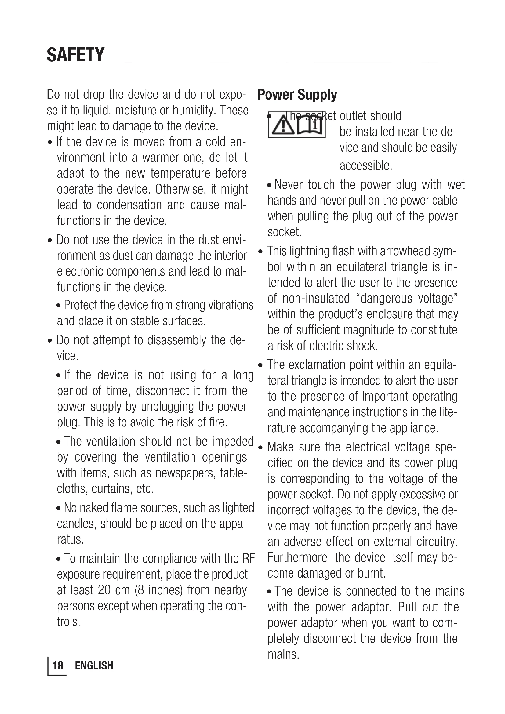 - The device is connected to the mains with the power adaptor. Pull out the power adaptor when you want to com- pletely disconnect the device from the mains.19 ENGLISH SAFETY ___________________________________