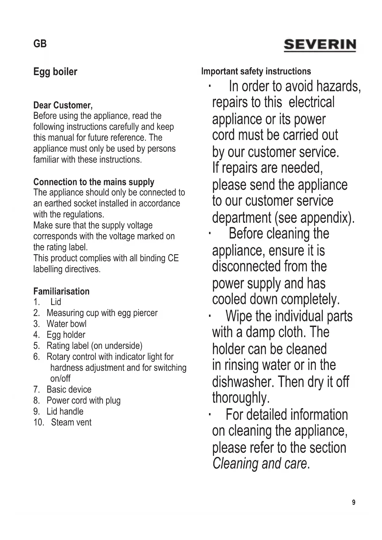 Egg boiler Dear Customer, Before using the appliance, read the following instructions carefully and keep this manual for future reference. The appliance must only be used by persons familiar with these instructions. Connection to the mains supply The appliance should only be connected to an earthed socket installed in accordance with the regulations. Make sure that the supply voltage corresponds with the voltage marked on the rating label. This product complies with all binding CE labelling directives. Familiarisation