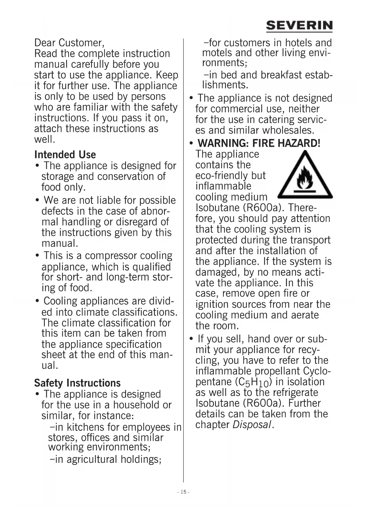 - WARNING: FIRE HAZARD! The appliance contains the eco-friendly but inammable cooling medium Isobutane (R600a). There- fore, you should pay attention that the cooling system is protected during the transport and after the installation of the appliance. If the system is damaged, by no means acti- vate the appliance. In this case, remove open re or ignition sources from near the cooling medium and aerate the room.