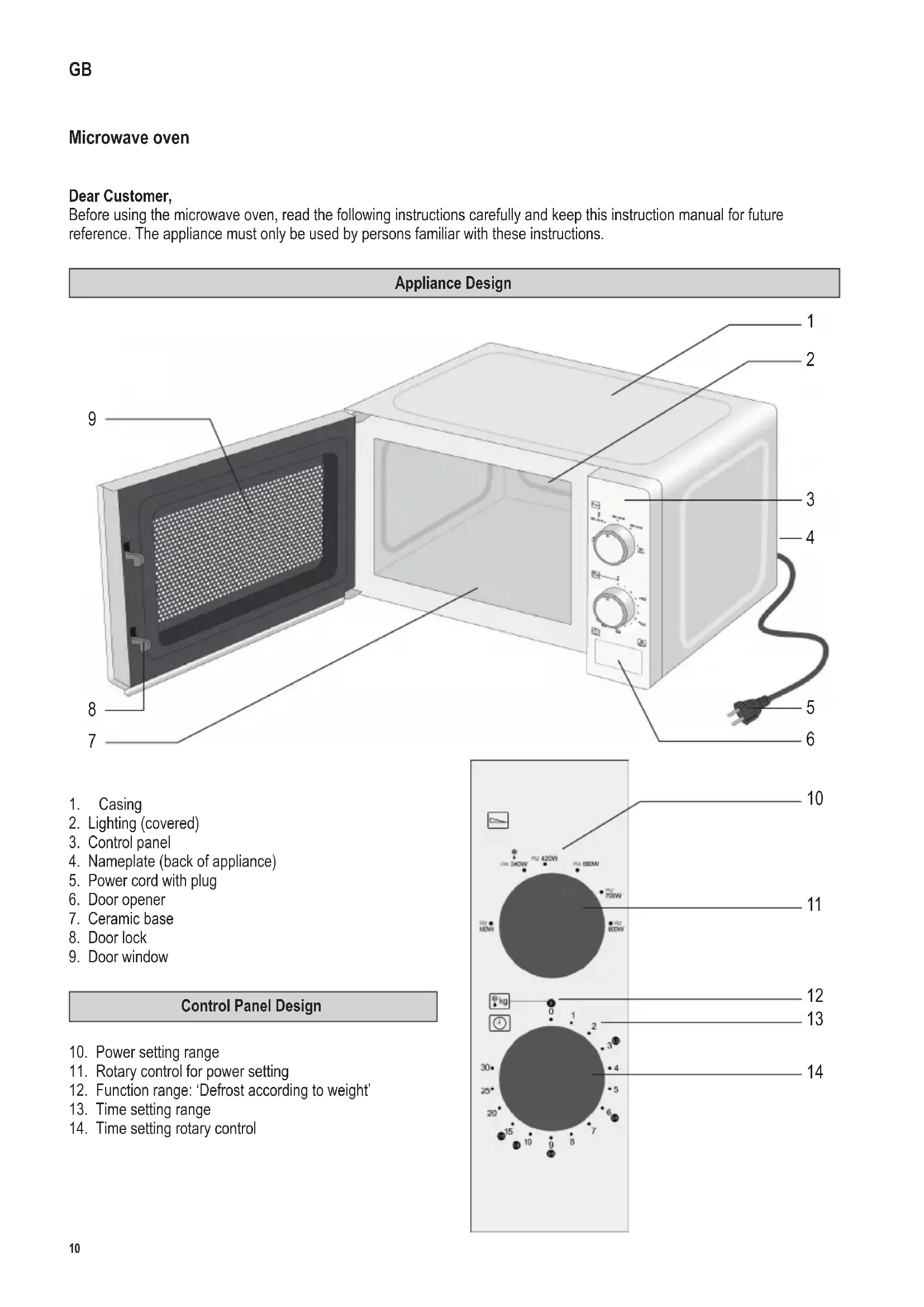 142 x 208 mm Safety instructions Important safety instructions Read the following instructions carefully and keep this instruction manual for future reference. Connection to the mains supply The appliance should only be connected to an earthed socket installed in accordance with the regulations. Make sure that the supply voltage corresponds with the voltage marked on the rating label. This product complies with all binding CE labelling directives. Positioning the unit ∙ Always place the microwave oven on a stable, level and heat-resistant surface, ensuring that it is protected from any heat source or excessive humidity. ∙ Do not operate the appliance outdoors. ∙ The feet on the base of the unit must not be removed. ∙ Sufcient ventilation must be ensured at all times. Do not place any objects on the unit, and make sure that the following minimum distances from any wall or other object are maintained: Sides: 7.5 cm Rear: 7.5 cm Top: 30.0 cm The unit must not be installed inside a cupboard; when positioning the unit, also ensure that it is not placed directly underneath a cupboard or any other similar object. Important notes ∙ Caution: Certain types of food may tend to catch re. Do not leave the appliance unattended while in use. ∙ This microwave oven is intended for the defrosting, heating and cooking of food only. Caution: Any attempt to dry food or clothing, to heat up warming pads, house slippers, sponges, wet cleaning cloths etc. may cause injuries, combustion or re. ∙ No responsibility will be accepted if damage results from improper use, or if these instructions are not complied with. ∙ Use only suitable kitchen utensils. Do not use any metal containers when heating up food or beverages using the microwave function. For detailed information, please refer to section Always use suitable kitchen utensils.12 142 x 208 mm ∙ The appliance is not intended to be operated by means of an external timer or separate remote-control system. ∙ This appliance may be used by children (at least 8 years of age) and by persons with reduced physical, sensory or mental capabilities, or lacking experience and knowledge, provided they have been given supervision or instruction concerning the use of the appliance and fully understand all dangers and safety precautions involved. ∙ Children must not be permitted to play with the appliance. ∙ Cleaning and user maintenance must not be carried out by children unless they are older than 8 years and are supervised. ∙ The appliance and its power cord must be kept well away from children under 8 at all times. ∙ To avoid any risk of electric shock, do not clean the appliance with liquids or immerse it in a liquid. ∙ Always switch the appliance off and remove the plug from the wall socket: - before cleaning, - in case of any malfunction, - after each use. ∙ When removing the plug from the wall socket, never pull on the power cord; always grip the plug itself.