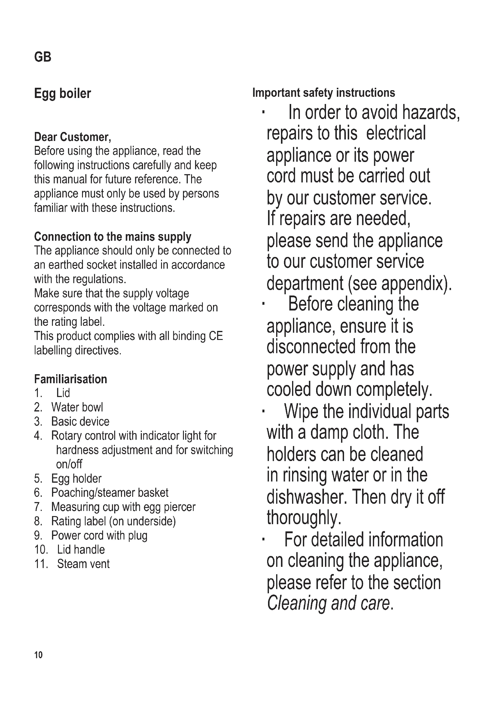 Important safety instructions ∙ In order to avoid hazards, repairs to this electrical appliance or its power cord must be carried out by our customer service. If repairs are needed, please send the appliance to our customer service department (see appendix). ∙ Before cleaning the appliance, ensure it is disconnected from the power supply and has cooled down completely. ∙ Wipe the individual parts with a damp cloth. The holders can be cleaned in rinsing water or in the dishwasher. Then dry it off thoroughly. ∙ For detailed information on cleaning the appliance, please refer to the section Cleaning and care. GB104 x 142 mm