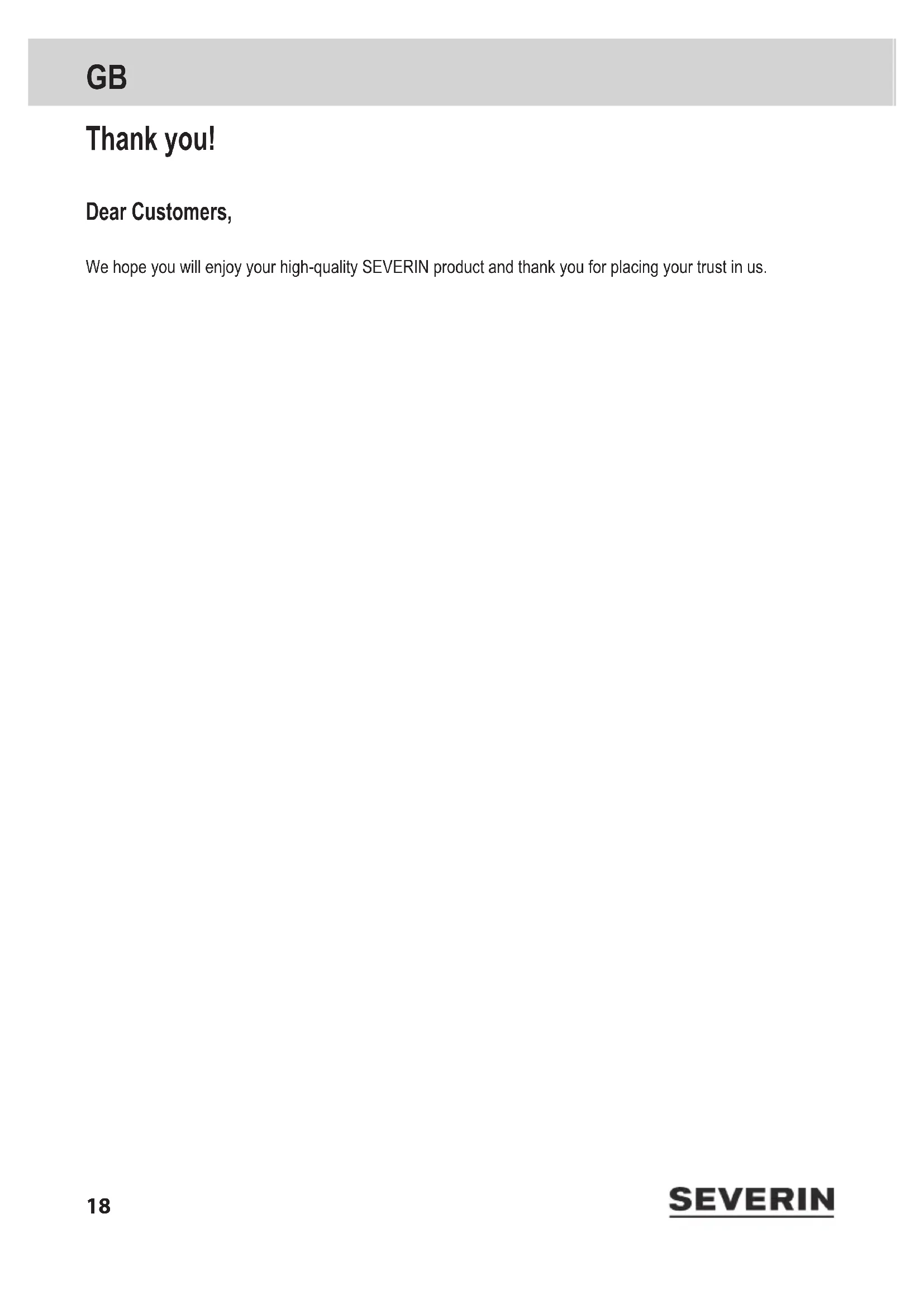 - Nur mit einem funktionstüchtigen Akku ist das Gerät wieder einsatzbereit. Falls kein funktionstüchtiger Akku eingesetzt wurde, Gerät nicht in Betrieb nehmen. 10 Entsorgen Geräte und Akkus, die mit diesem Symbol gekennzeichnet sind, müssen getrennt vom Hausmüll entsorgt werden. Diese Geräte und Akkus enthalten wertvolle Rohstoffe, die wiederverwertet werden können. Eine ordnungsgemäße Entsorgung schützt die Umwelt und die Gesundheit Ihrer Mitmenschen. Gerät und den ausgebauten Akku separat zur Entsorgung an die entspre- chenden Sammelstellen geben. Ihre Gemeindeverwaltung oder Ihr Fachhändler gibt Auskunft zur ordnungsgemäßen Entsorgung.16 GaranTiE 11 Garantie Von den nachfolgenden Garantiebedingungen bleiben die gesetzlichen Gewährleistungsrechte gegenüber dem Verkäufer und eventuelle Verkäufergarantien unberührt. Sollte eine Reparatur erforderlich werden, setzen Sie sich telefonisch oder per E-Mail mit unserem Kundendienst in Verbindung. Die Kontaktdaten nden Sie im Anhang dieser Gebrauchsanleitung. Wenden Sie sich im Garantiefall alternativ auch direkt an den Händler. Zusätzlich gewährt SEVERIN eine Herstellergarantie von zwei Jahren ab Kaufdatum. In diesem Zeitraum beseitigen wir kostenlos alle Mängel, die nachweislich auf Material- oder Fertigungsfehlern beruhen und die Funktion wesentlich beeinträchtigen. Weitere Ansprüche sind ausgeschlossen. Von der Garantie ausgenommen sind: Schäden, die auf Nichtbeachtung der Gebrauchsanleitung, unsachge- mäße Behandlung oder normalen Verschleiß zurückzuführen sind, ebenso leicht zerbrechliche Teile wie z. B. Glas, Kunststoff oder Glühlampen. Die Garantie erlischt bei Eingriff nicht von SEVERIN autorisierter Stellen. Wenn Ihnen diese Tabelle nicht weiterhilft, wenden Sie sich an unseren Kundendienst. Die Kontaktdaten nden Sie im Anhang dieser Gebrauchsanleitung oder auf www.severin.de.17 GaranTiE18 Thank you! Dear Customers, We hope you will enjoy your high-quality SEVERIN product and thank you for placing your trust in us. Gb19 About this instruction manual This instruction manual includes important tips for your safety and the use of the appliance. Failure to observe the instruction manual can result in personal injuries or damage to the appliance. Keep the instruction manual in a safe place. When passing the appliance on to a third party, also include the instruction manual. Read the instruction manual completely before initial use of the appliance. Illustrated Quick Start Guide included This instruction manual comes with an Quick Start Guide that provides you with additional tips for the use and care of the appliance. If needed, this instruction manual and the Quick Start Guide can be downloaded online free of charge at www. severin.de. Contents 1 Technical data p. 20