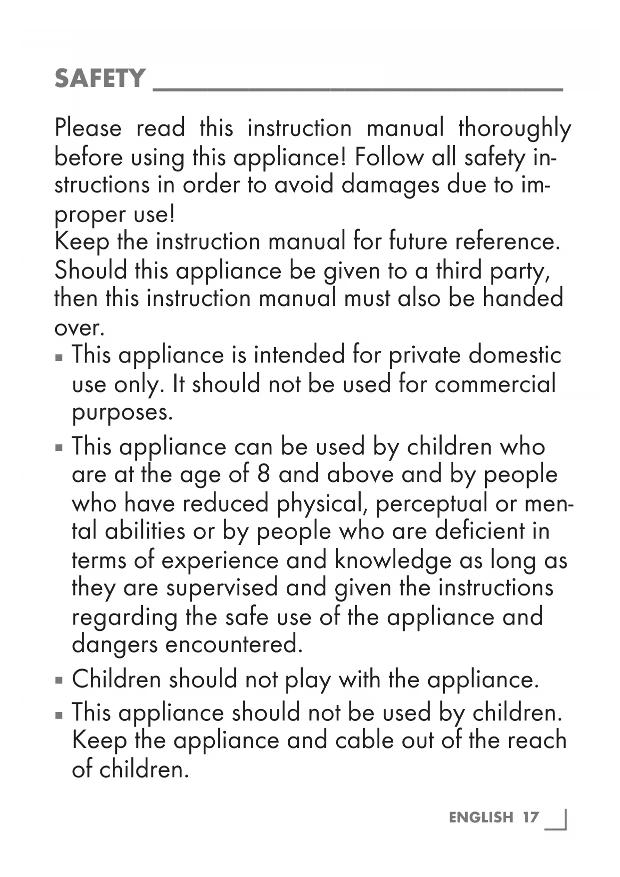 This appliance should not be used by children. Keep the appliance and cable out of the reach of children.18 ENGLISH SAFETY ______________________________