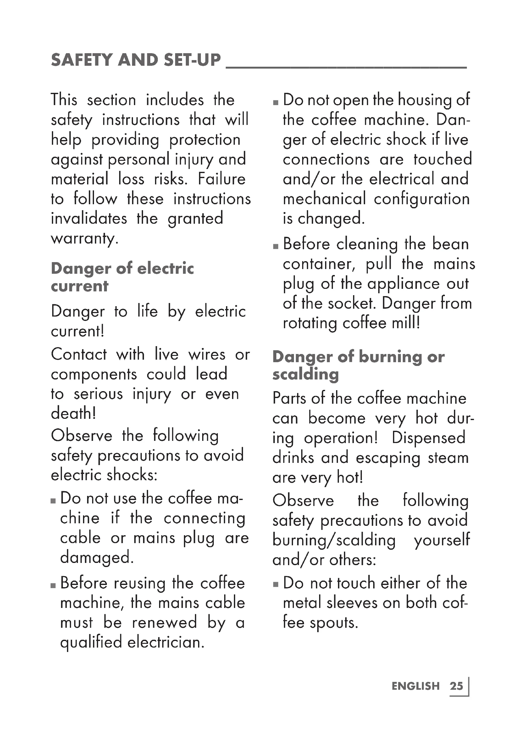 Before cleaning the bean container, pull the mains plug of the appliance out of the socket. Danger from rotating coffee mill! Danger of burning or scalding Parts of the coffee machine can become very hot dur- ing operation! Dispensed drinks and escaping steam are very hot! Observe the following safety precautions to avoid burning/scalding yourself and/or others: