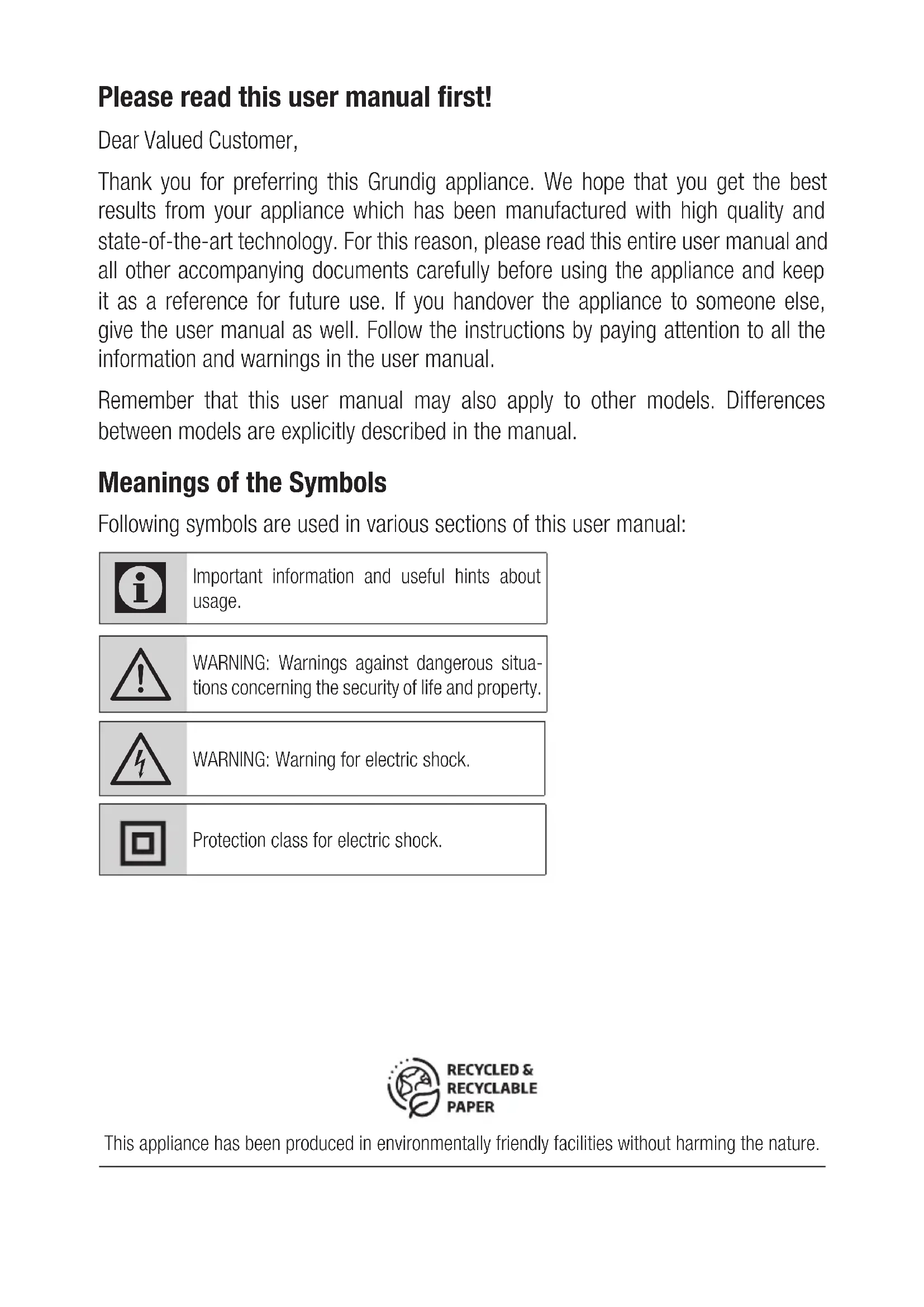 Protection class for electric shock. This appliance has been produced in environmentally friendly facilities without harming the nature.23 ENGLISH safety and operating instruc- tions should be retained for fu- ture reference.
