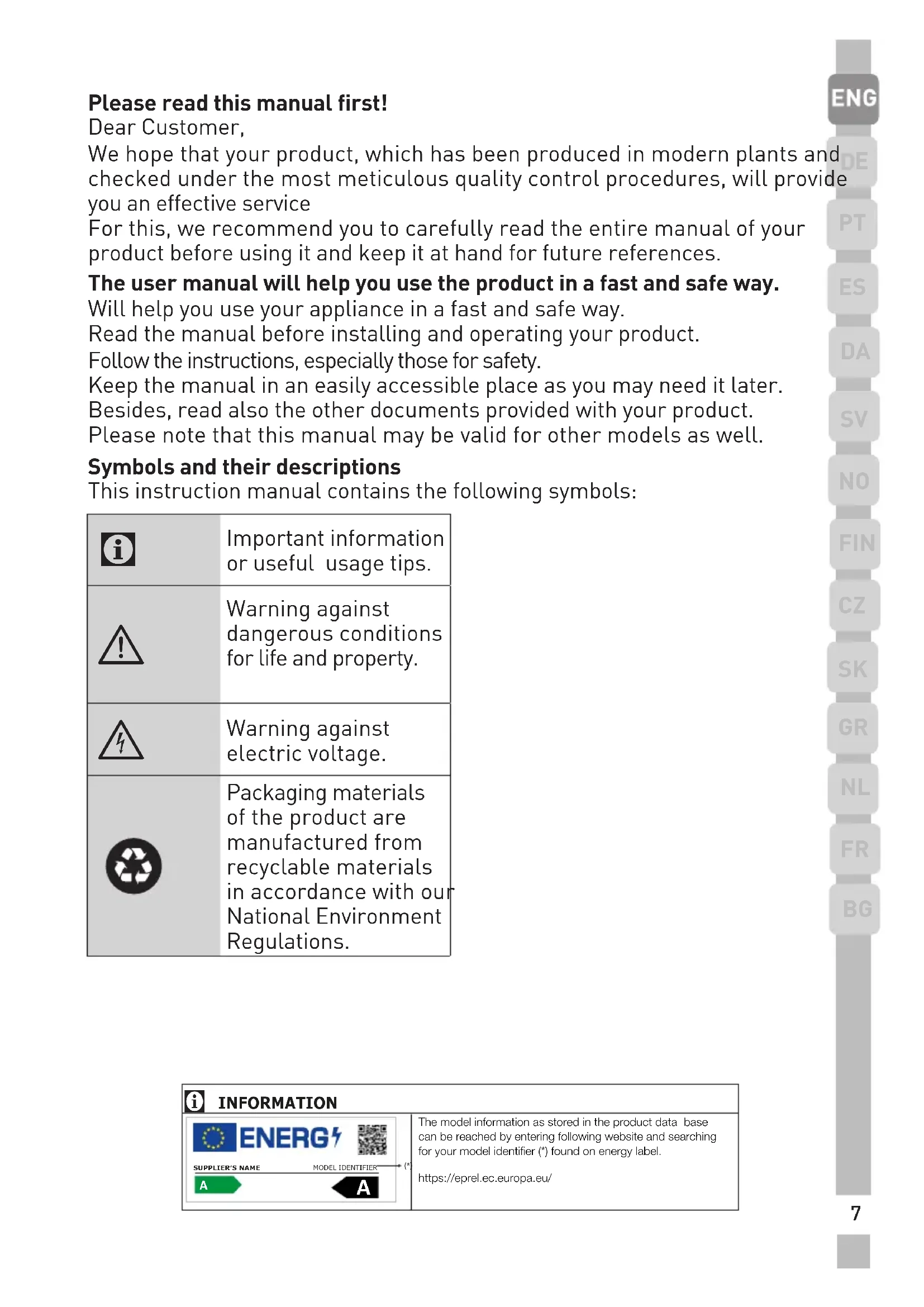 Please read this manual first! Dear Customer, We hope that your product, which has been produced in modern plants and checked under the most meticulous quality control procedures, will provide you an effective service For this, we recommend you to carefully read the entire manual of your product before using it and keep it at hand for future references. The user manual will help you use the product in a fast and safe way. Will help you use your appliance in a fast and safe way. Read the manual before installing and operating your product. Follow the instructions, especially those for safety. Keep the manual in an easily accessible place as you may need it later. Besides, read also the other documents provided with your product. Please note that this manual may be valid for other models as well. Symbols and their descriptions This instruction manual contains the following symbols: