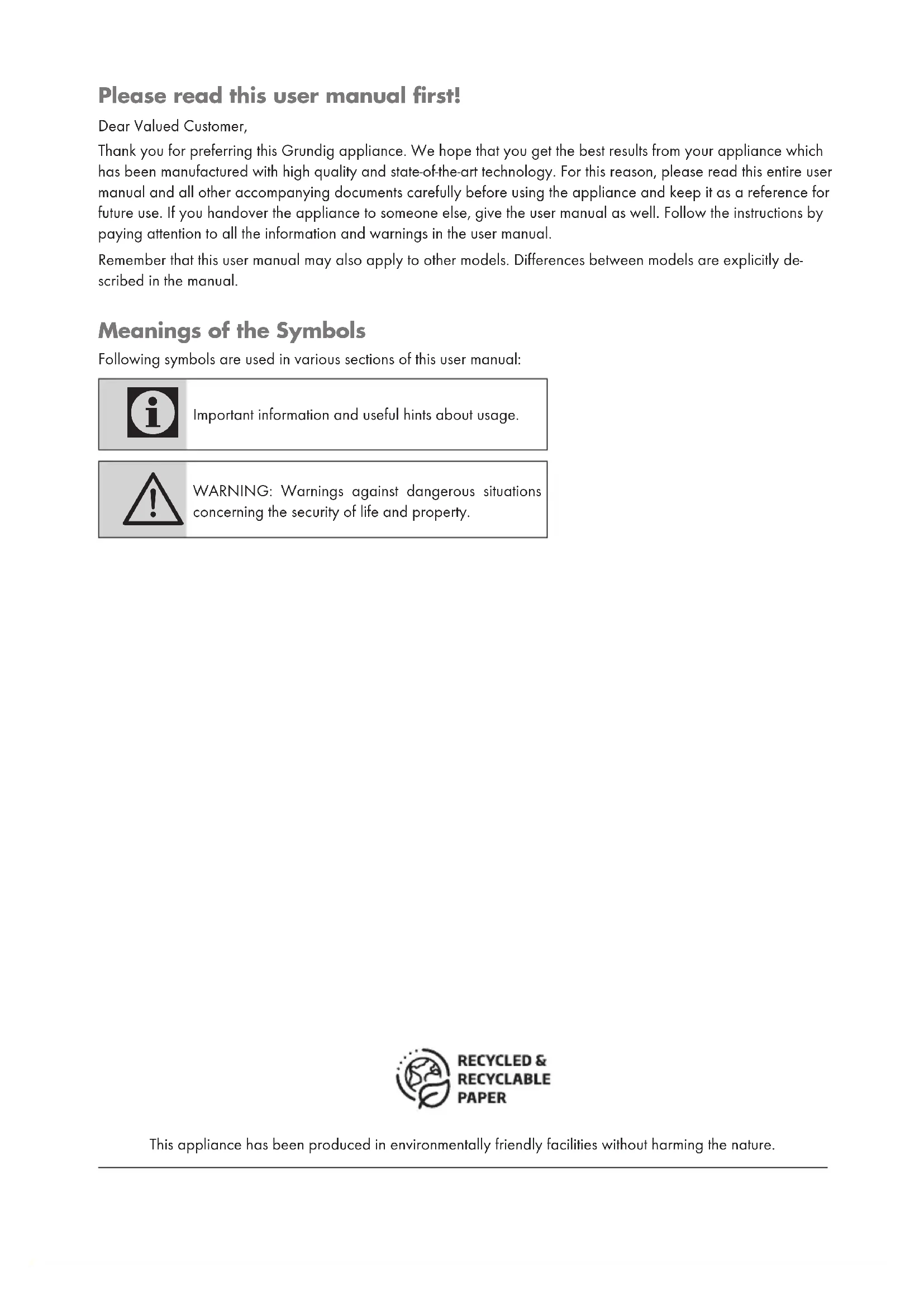 - gebührenpflichtig (0,145 €/Min. aus dem Festnetz, Mobilfunk: max. 0,20 €/Min.) Haben Sie Fragen? Unser Kundenberatungszentrum steht Ihnen werktags stets von 8.00 - 18.00 Uhr zur Verfügung.Please read this user manual first! Dear Valued Customer, Thank you for preferring this Grundig appliance. We hope that you get the best results from your appliance which has been manufactured with high quality and state-of-the-art technology. For this reason, please read this entire user manual and all other accompanying documents carefully before using the appliance and keep it as a reference for future use. If you handover the appliance to someone else, give the user manual as well. Follow the instructions by paying attention to all the information and warnings in the user manual. Remember that this user manual may also apply to other models. Differences between models are explicitly de- scribed in the manual. Meanings of the Symbols Following symbols are used in various sections of this user manual: