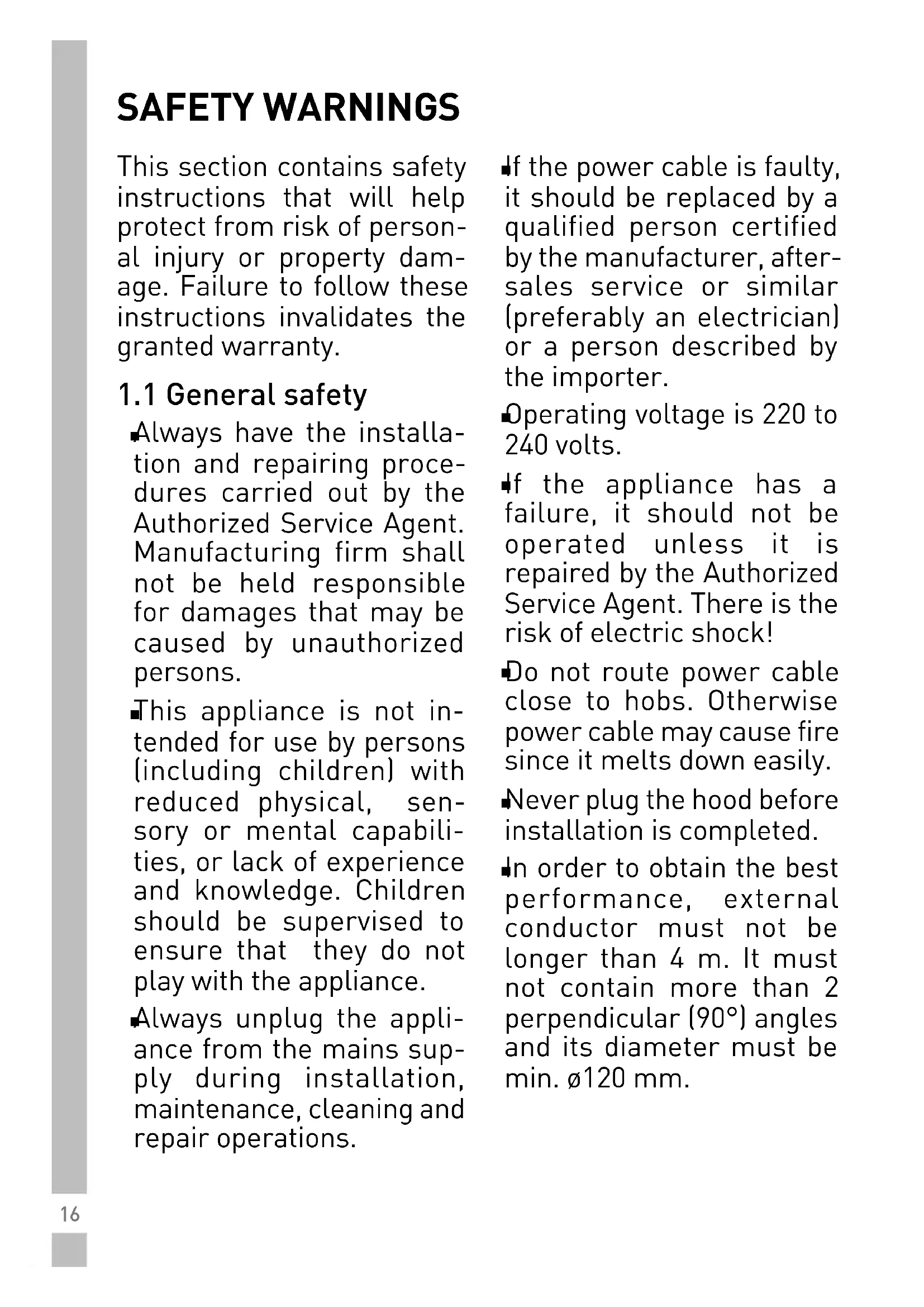 SAFETY WARNINGS This section contains safety instructions that will help protect from risk of person- al injury or property dam- age. Failure to follow these instructions invalidates the granted warranty.